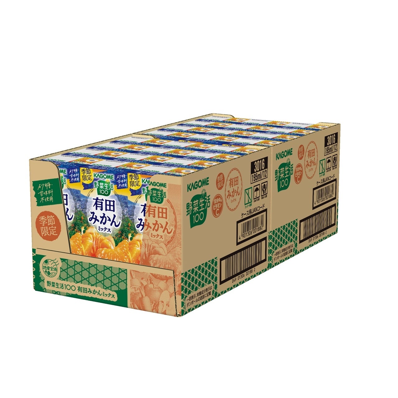 「野菜生活100有田みかんミックス」は、和歌山県産の有田みかんを使用した野菜・果実100%ミックスジュースです。有田みかんの豊かな香りとコクのある甘さを、りんご果汁とオレンジ果汁のバランスで引き立て、こたつで食べるみかんのような味わいとしました。朝食のおともやリフレッシュしたいときにおすすめです。パッケージには、有田市の山側から見たみかん畑をデザインしています。