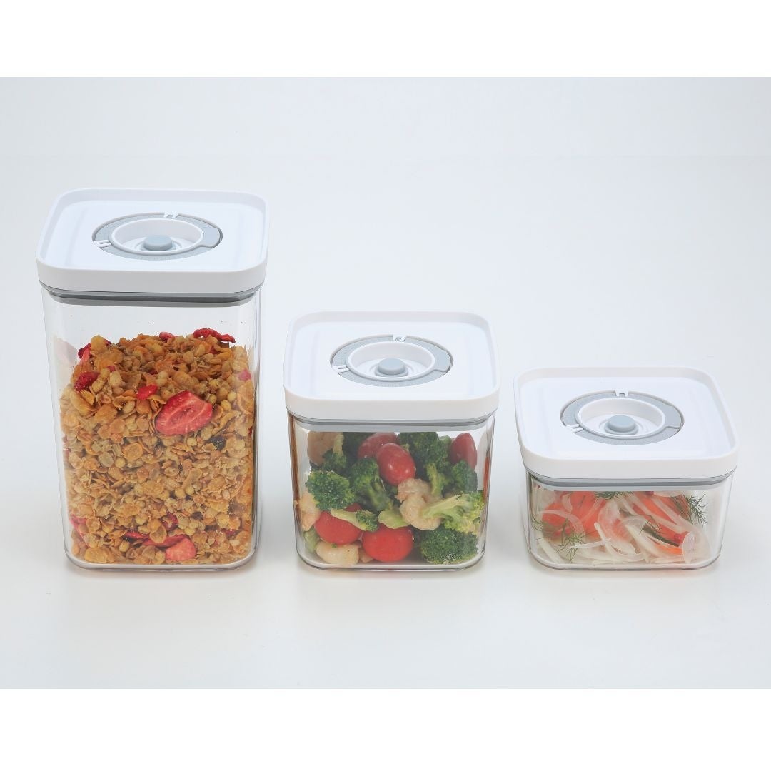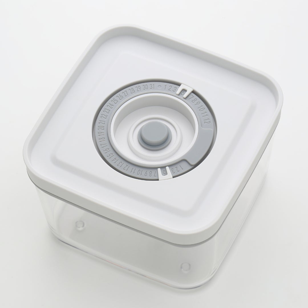 コンテナのふたには日付ダイヤルが付いており、真空にした日付や調理日、賞味期限をセットして保存管理に役立ちますできるので、保存日や賞味期限の管理に活用いただけます。また、3サイズの コンテナは重ねられ、不使用時使わないときの収納や冷蔵庫等での保存時に便利です。