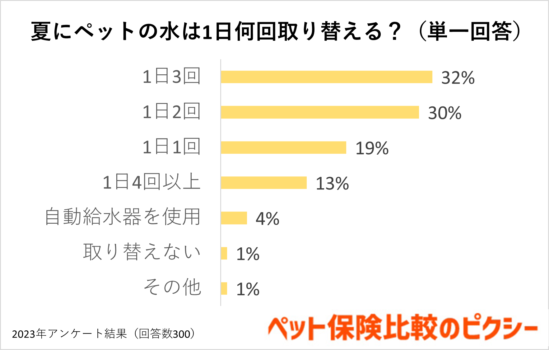 夏の間、ペットの水は1日に何回取り替えるかを聞いたところ、1位は「1日3回(32%)」、2位「1日2回(30%)」でした。