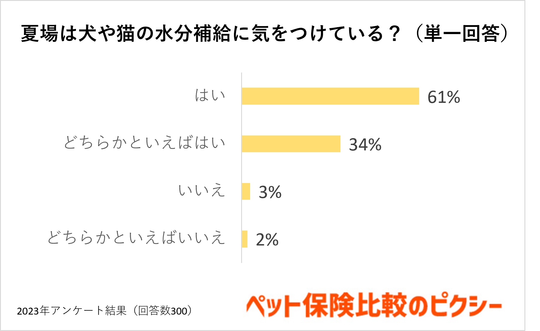 まず、夏場は犬や猫の水分補給に気を付けているかどうかを質問したところ、「はい」または「どちらかといえばはい」と答えた方が圧倒的に多く95%にのぼりました。「いいえ」、「どちらかといえばいいえ」と答えた方はわずか5%でした。
