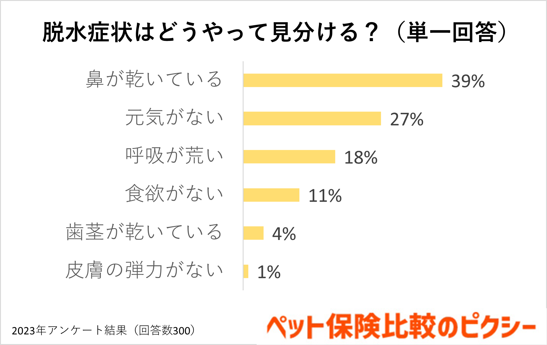 ペットの脱水症状を見分けるには何をチェックするかを聞いたところ、1位は「鼻が乾いている(39%)」でした。