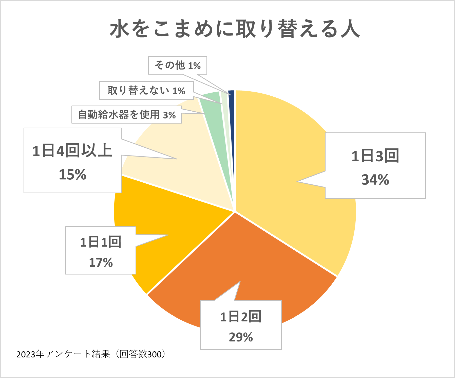 「水をこまめに取り替える」ことに気を付けている飼い主さまは、1日に何回ほどペットの水を取り替えているのでしょうか。順位に変動はありませんでしたが、「1日3回」、「1日4回以上」と答えた方の割合がより多い結果となりました。