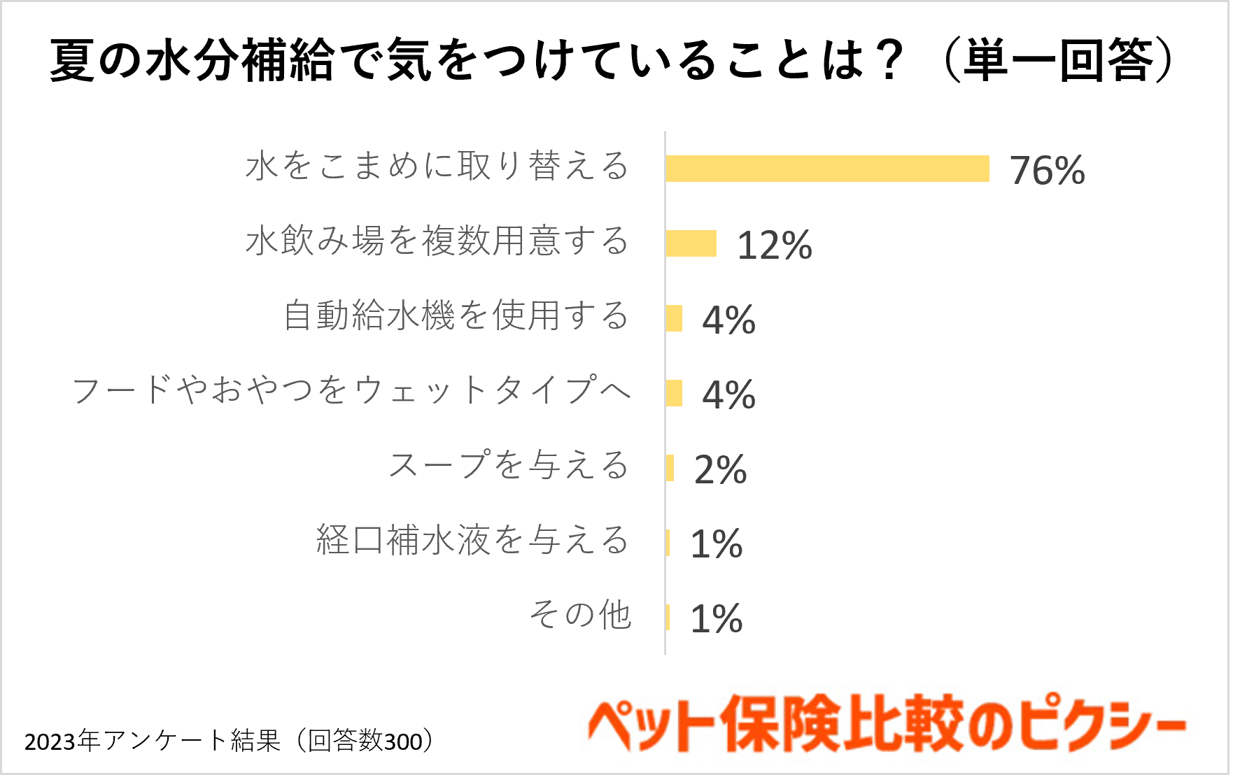 次に、ペットの夏の水分補給について、具体的に気を付けていることを聞いたところ、1位は「水をこまめに取り替える(76%)」でした。