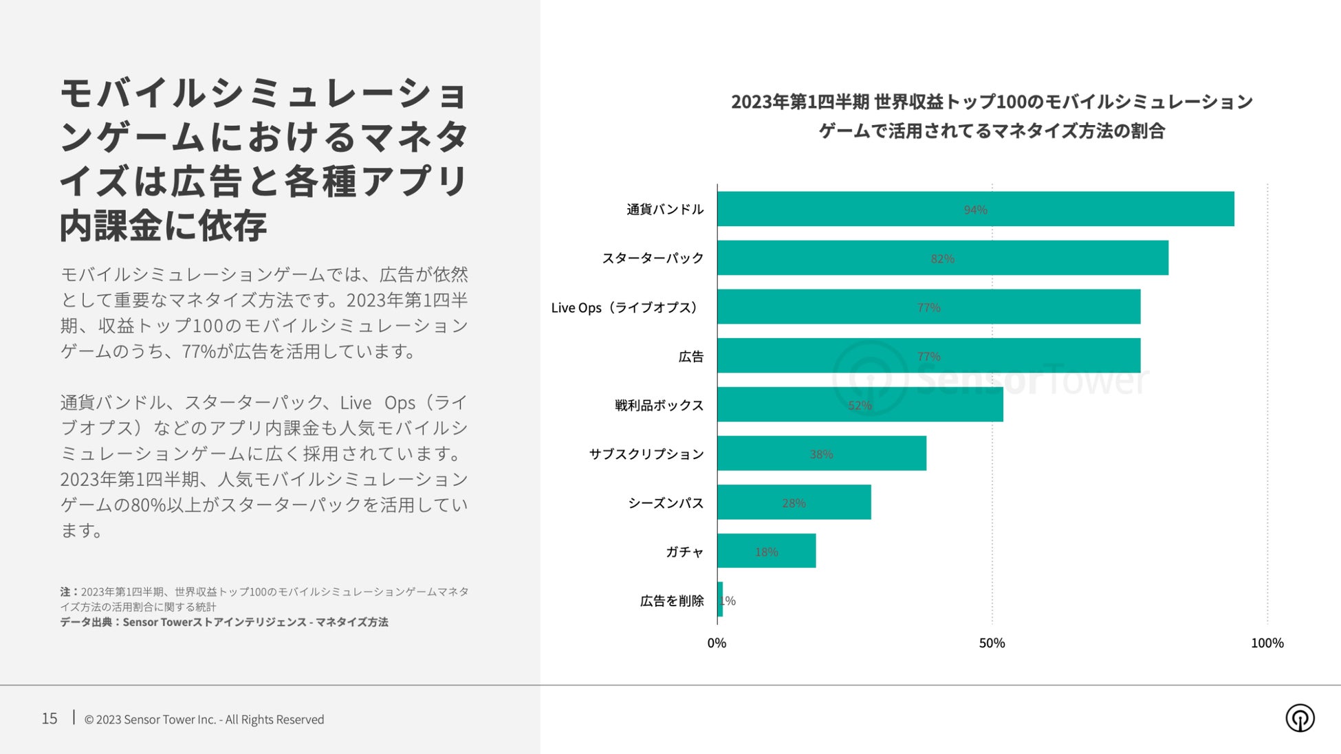 モバイルシミュレーションゲームでは、広告が依然として重要なマネタイズ方法です。2023年第1四半期、収益トップ100のモバイルシミュレーションゲームのうち、77%が広告を活用しています。人気モバイルシミュレーションゲームには通貨バンドル、スターターパック、Live Ops(ライブオプス)などのアプリ内課金も広く採用されています。
