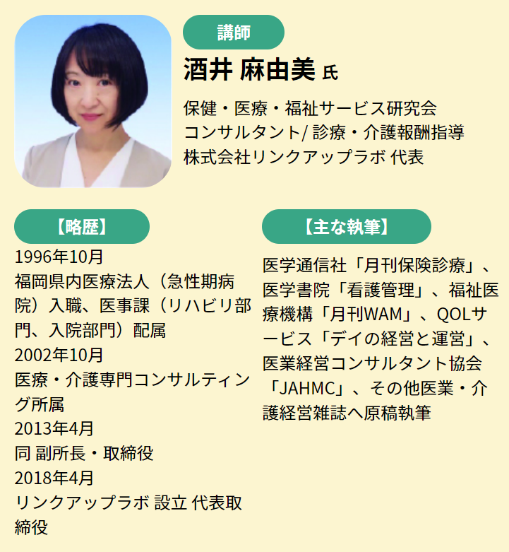 多くの病院グループや介護施設でのコンサルティング実績がある酒井麻由美先生が、丁寧な解説で「あなたの知りたい!」に応えます。