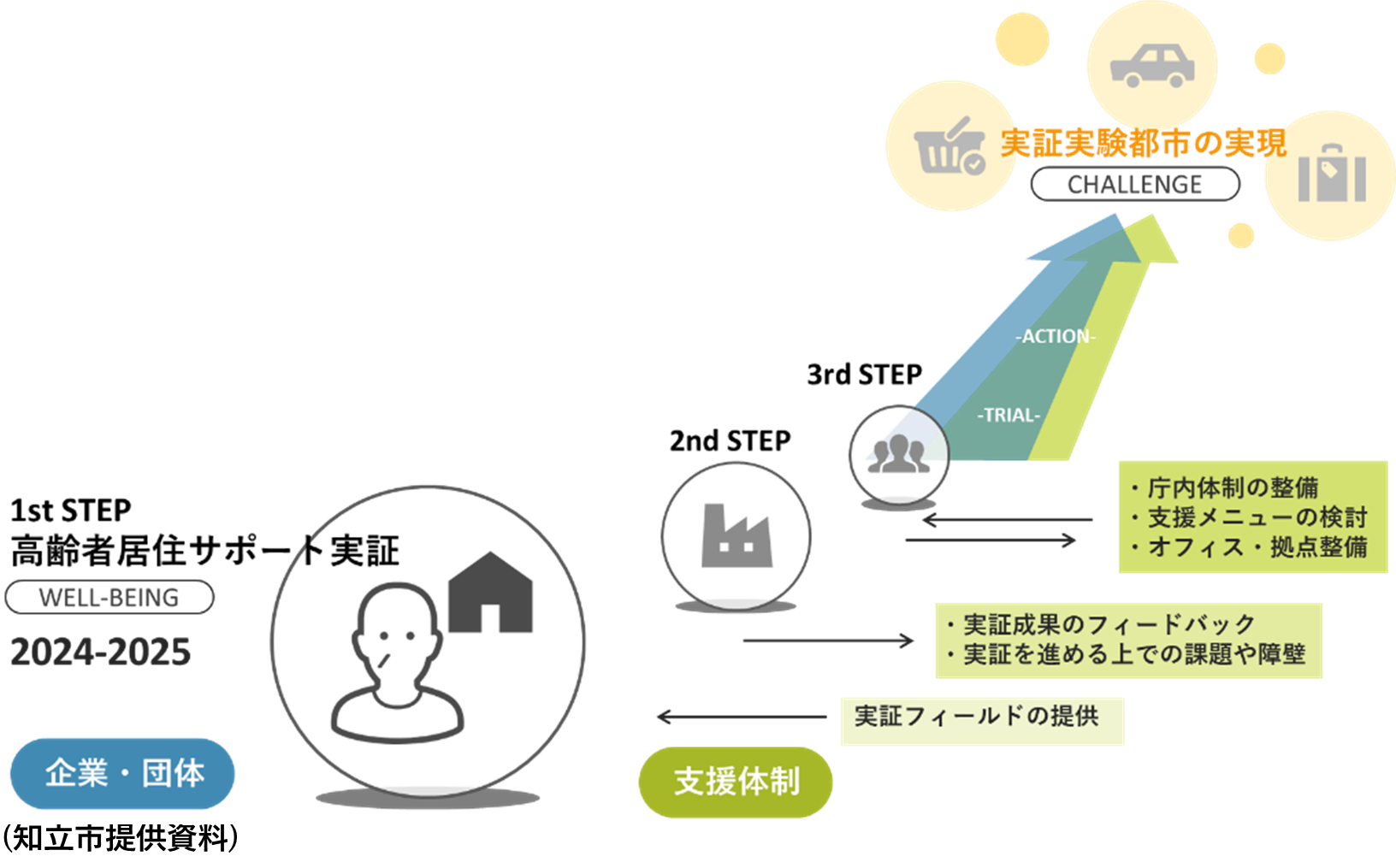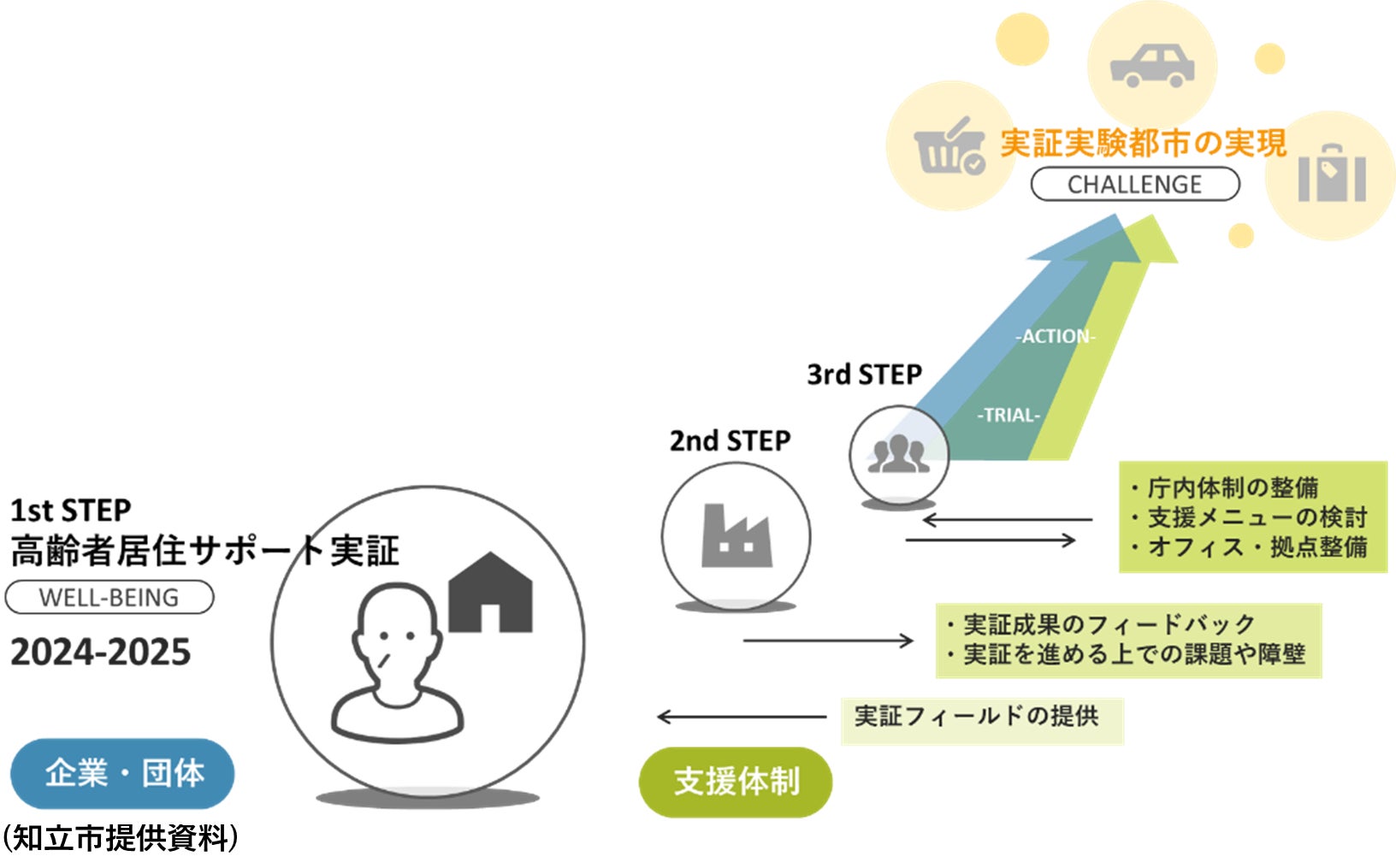 知立市は、2024年3月に公表した「知立駅周辺エリア未来ビジョン(中間とりまとめ)」(以下 「未来ビジョン」)に基づき、新技術や新サービスの実証実験を行いやすいまち「実証実験都市」の実現に取り組んでいきます。その取り組みの第一弾として、地元企業であるFUJIと野村開発、知立市共同で『高齢者居住サポート実証プロジェクト』を開始します。本プロジェクトでは、高齢者の賃貸住宅への入居条件の緩和等の可能性を検証し、高齢者が安心して住居を借りることができるエリアの実現を目指します。
