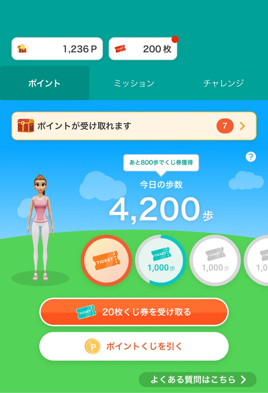 ポイント画面のデザインを変更し、「今日の歩数」と500歩ごとに1周する「リング」が貯まっている様子をさらに見やすくアップデートしました。歩く→リングが貯まる→くじ券を受け取る→ポイントくじを引くの流れがより分かりやすくなりました。
