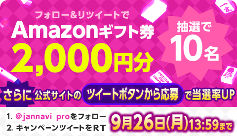 2022年9月16日(金)12:00よりオンライン麻雀アプリ「ジャンナビ麻雀オンライン」Twitter公式アカウントにて抽選でamazonギフト券2000円分を10名様にプレゼントするキャンペーンを実施いたします。