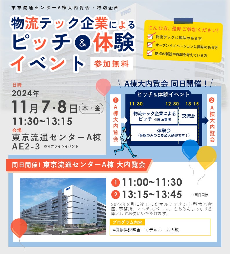 ピッチイベントでは、東京流通センター施設内の「TRC LODGE」(物流に携わる企業が抱えるさまざまな課題の解決に役立つ最新の物流TECHに触れられる常設展示ゾーン)の出展企業やきらぼし銀行が支援している物流テック企業の皆さまにご登壇いただきます。