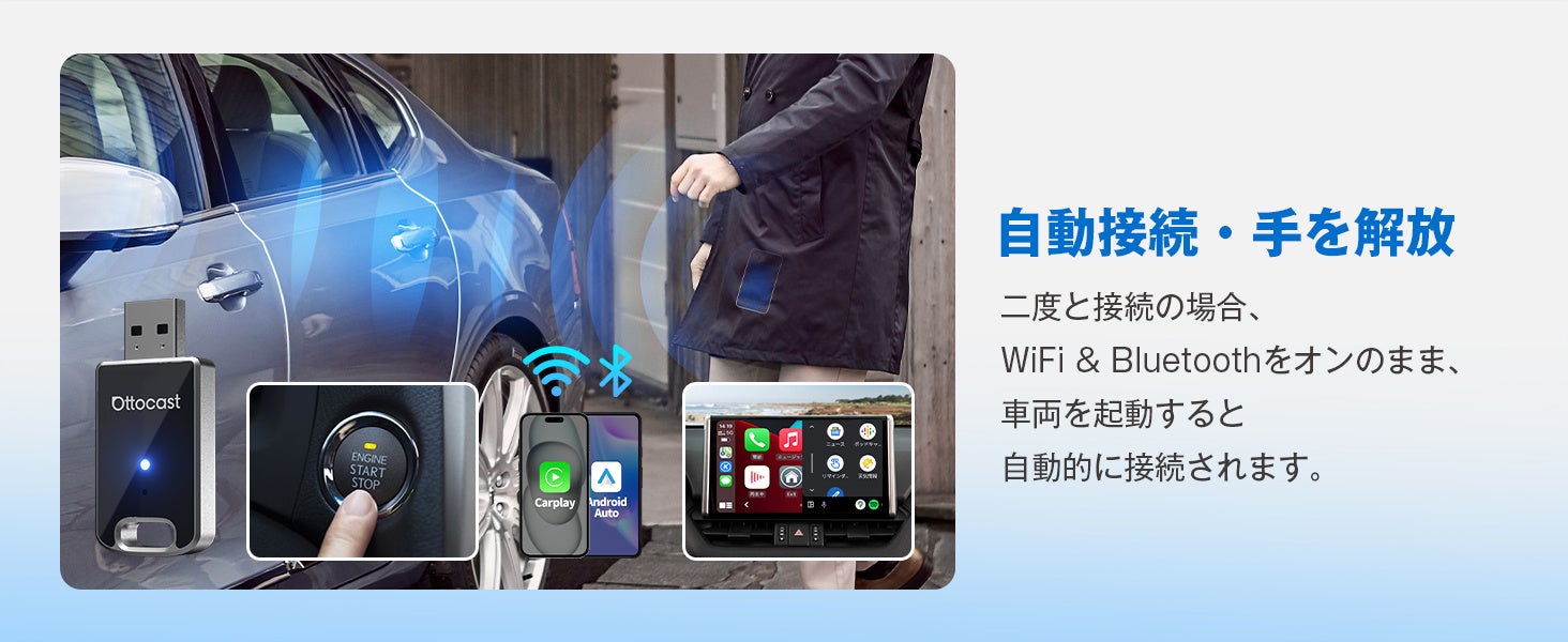 雑多なケーブルを捨てよう、人気沸騰のオットキャストは、ワイヤレスアダプター「オットキャストMini」を最新登場!差し込むだけでCarPlayまたはAndroid Autoをワイヤレス接続できます!