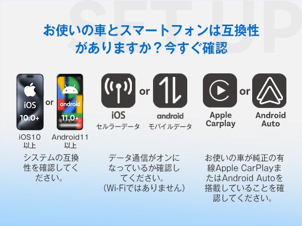 ■ご使用の前に、ご車両にApple CarPlayまたはAndroid Autoが搭載されているかどうかをご確認ください。