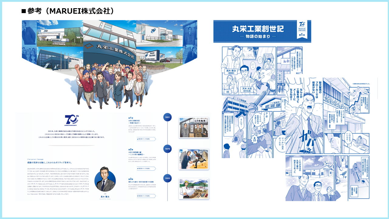 「周年マンガ特設WEBサイト」は、単純に会社の歴史を残すだけではなく、お客様にも従業員にも気軽に会社の歴史を知ってもらうことができ、エンゲージメント向上・ブランディングに寄与できます。また、求職者に対して分かりやすく会社のことを伝えることのできる採用ツールとしてもご活用いただけます。