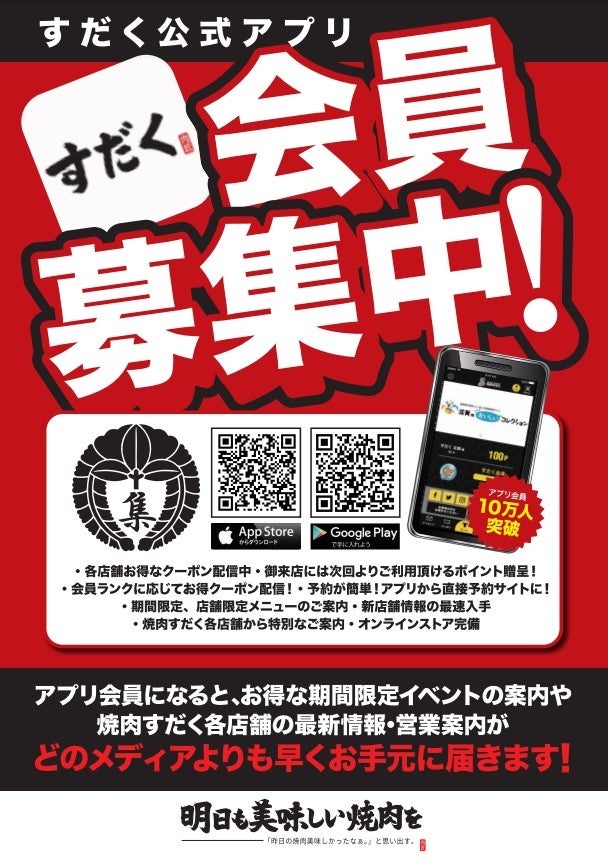 ウーロン茶無料!「近江焼肉ホルモンすだく」の公式アプリをダウンロード!