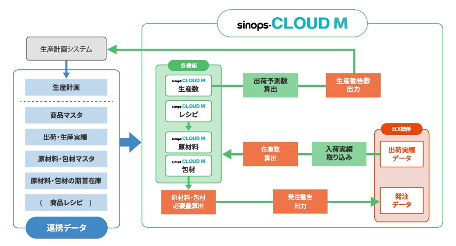 「sinops-CLOUD M」は、4つの機能で構成される食品製造業向けの需要予測型自動発注サービスです。まず「生産数」機能は、出荷実績データをもとに需要を予測し、過剰生産や欠品を抑制した効率的な生産計画の作成を支援します。次に「原材料」「包材」機能は、生産計画に基づいて原材料や包装資材の必要量を算出し、EDI* による自動発注を行います。在庫管理や発注にかかる負担を軽減し、廃棄ロス・機会ロス削減に寄与します。さらに「レシピ」機能では、原材料と包装資材のレシピ管理に加え、成分やアレルギー表示を自動生成し、安全で正確な食品表示ラベルを作成します。