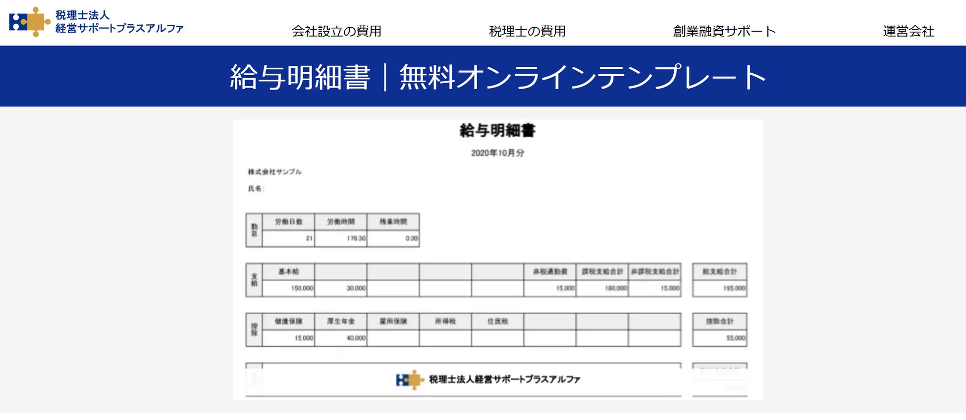 起業家のチャレンジを総合的に支援する株式会社経営サポートプラスアルファホールディングス(所在地:東京都豊島区)および税理士法人経営サポートプラスアルファ(同左)は、オンラインで給与明細書を作成できる「給与明細書|無料オンラインテンプレート」を提供しています。
