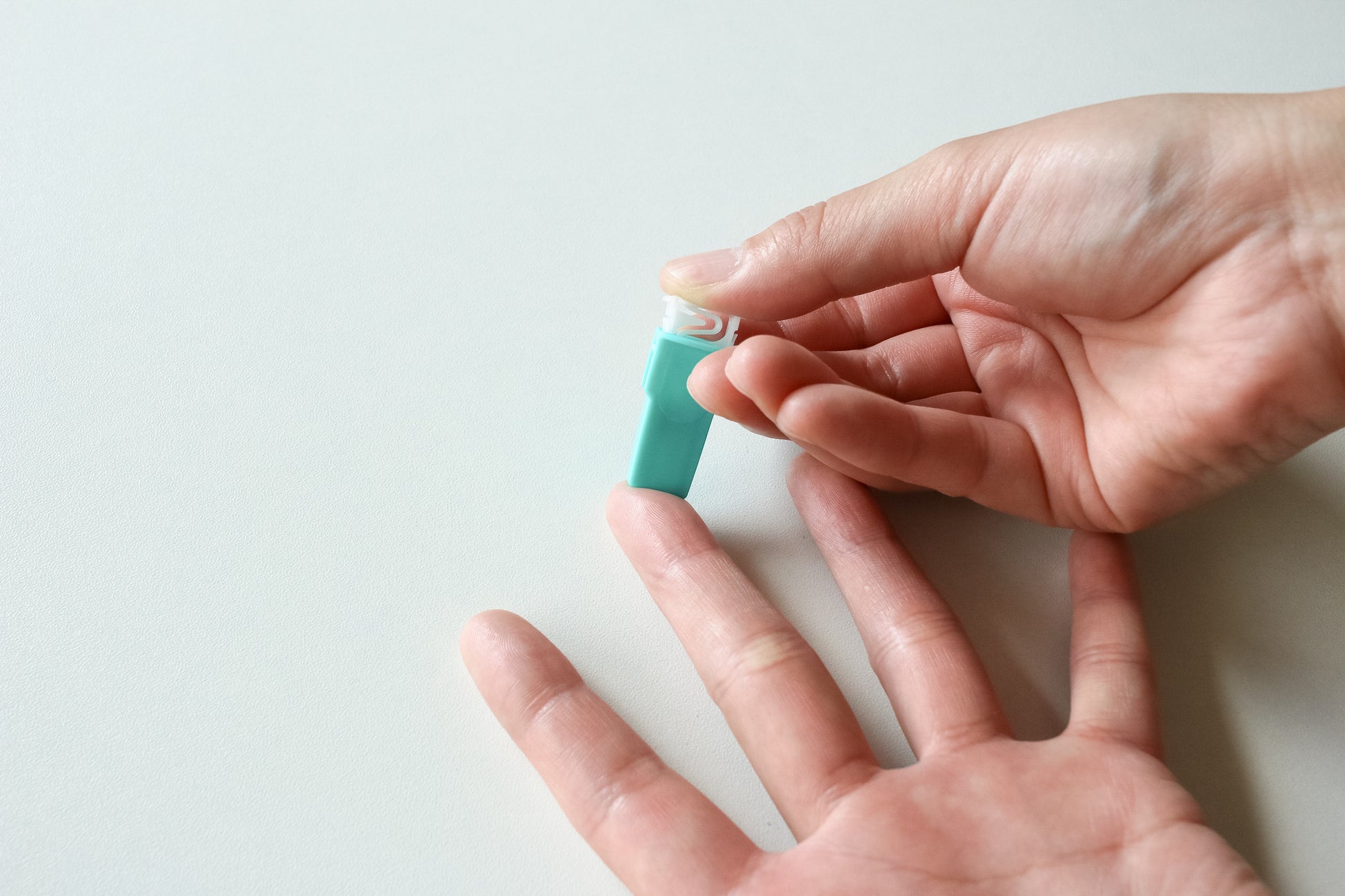 指先の採血はごく少量で、ろ紙に染み込ませるだけととても簡単な方法を採用。