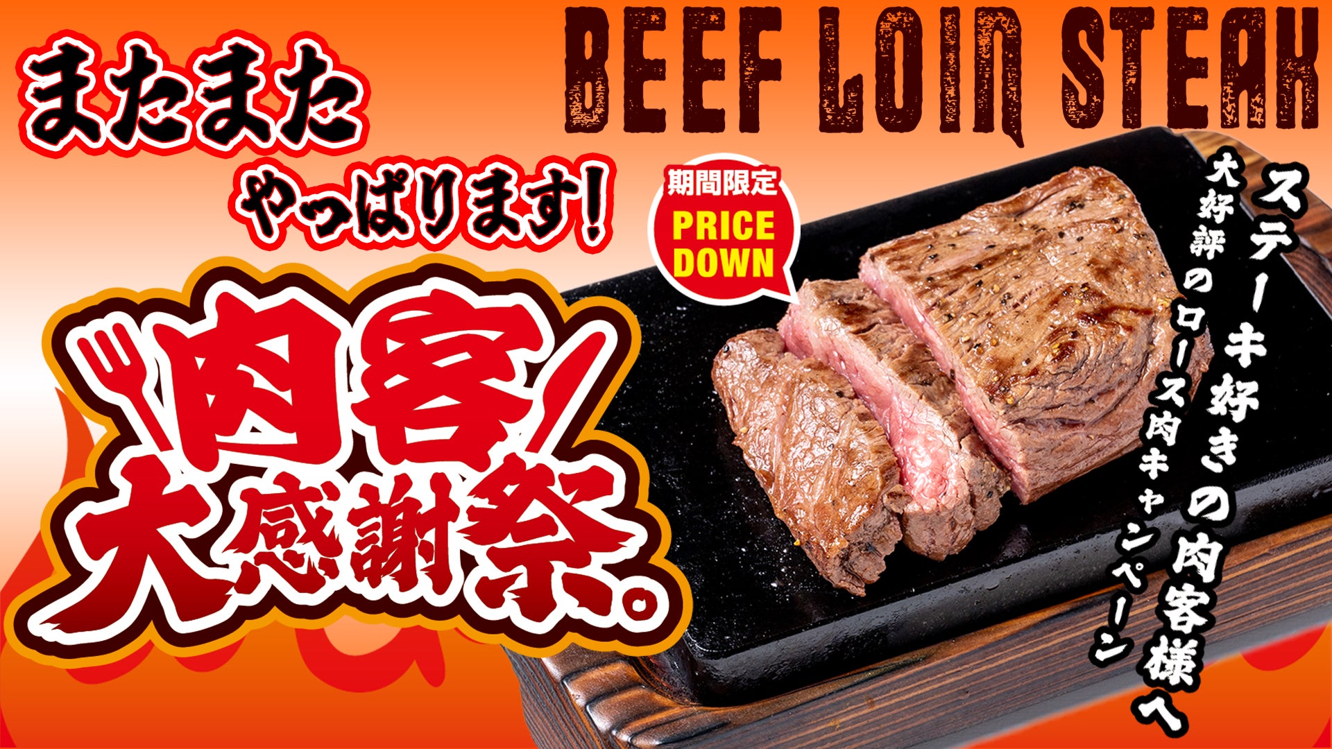 あの超人気企画が復活!やっぱりステーキ肉客大感謝祭。お客様への日頃の感謝の気持ちを込めてロースステーキがお得に!