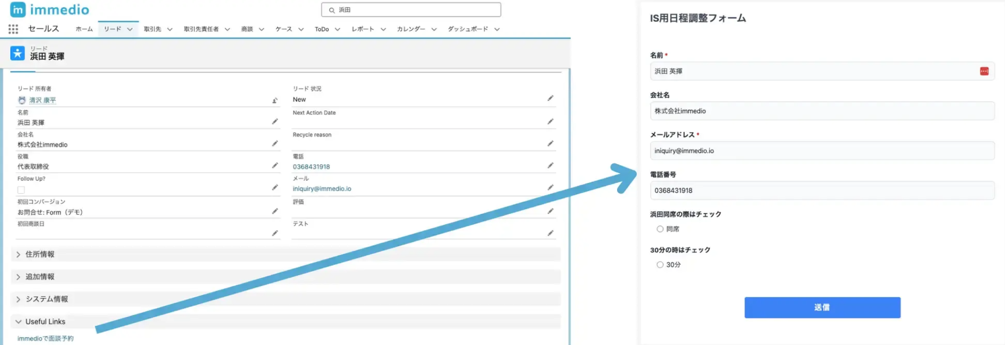 「immedio」は電話しなくてもアポが取れる 商談獲得自動化サービスです。各企業が現在利用するフォームとThanksページに「immedio」提供のタグを埋め込むことにより、Thanksページ上に日程調整画面が自動的に表示されます。フォームの入力情報が「immedio」に同期されているため、自動的にリードの見極め・割当てが行われており、日程調整画面には適切な担当者の空き時間が提示されます。Google・Outlook等のカレンダーやZoom・Meet・Teamsといったビデオ会議ツールと連携しているため、見込み客が日程を選択した時点でビデオ会議のURLが入った会議通知が自動で送信されます。