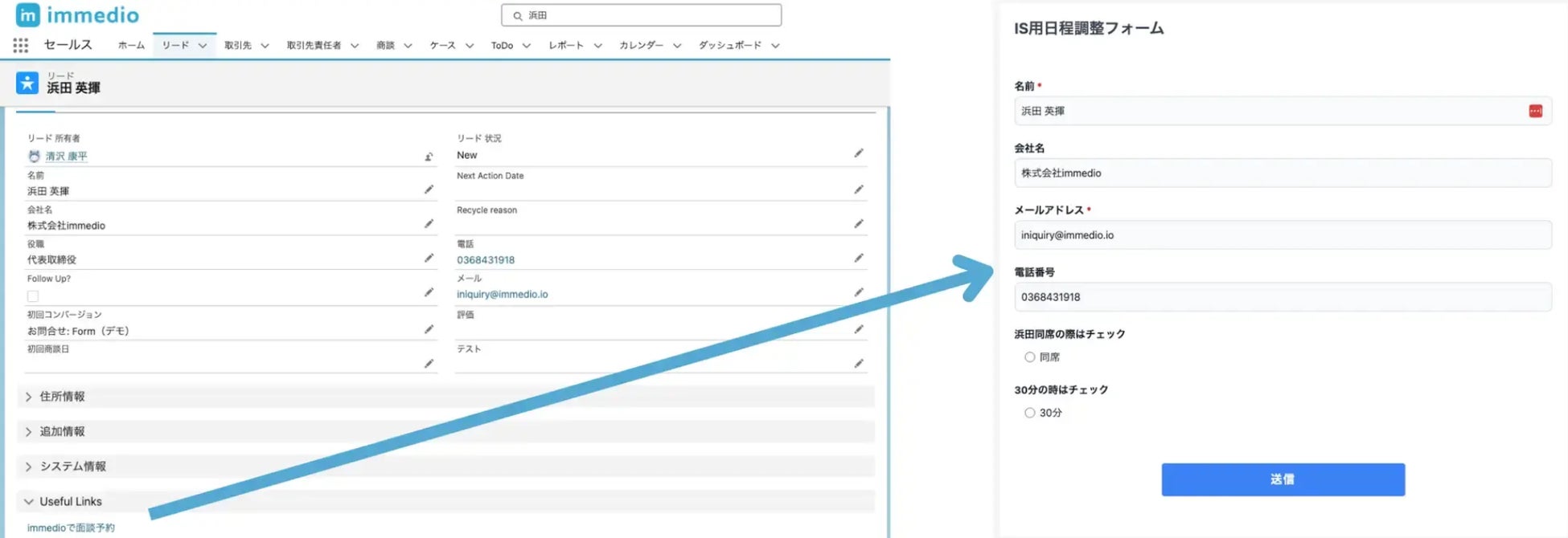 従来のURL型日程調整ツールで同様な使い方をした場合、フォームと連携していないため日程選択後に再度個人情報を入力する必要が生じ、多くの離脱が発生します。また、全ての見込み客に営業担当者の空き時間が表示されてしまうため、不要な商談やミスマッチな商談が生じてしまいます。「immedio」であれば、フォーム情報と連携しているため、情報の再入力は不要です。また、リード情報に応じてあらかじめ設定した営業担当を自動的に割り当てるため、適切な商談担当を効率的にアサインすることが可能です。「immedio」は、特許取得済みの独自技術を活用し、商談化率や受注率の大きな改善を実現しています。