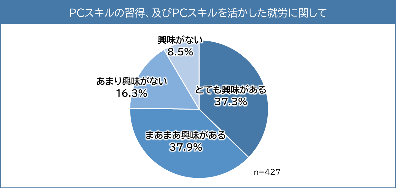 mitorizが登録キャストに実施した事前アンケートでは、「PCスキルの習得、及びPCスキルを活かした就労」に関して、「とても興味がある(37%)」「まあまあ興味がある(38%)」と、合わせて75%の人が“興味あり”と回答しております。