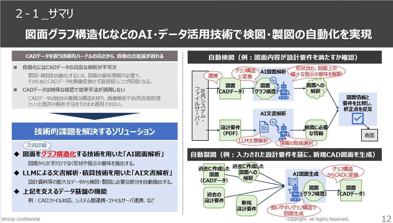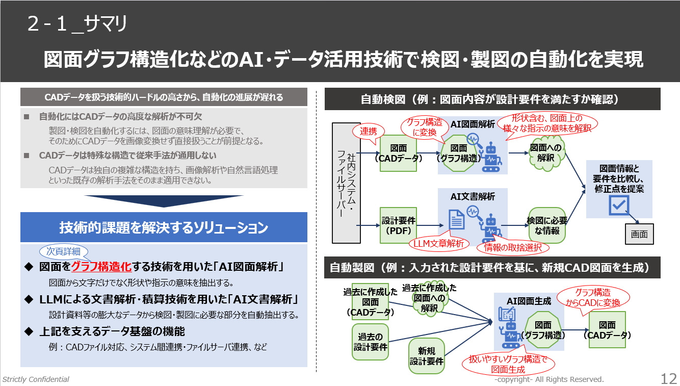 製造業・建設業において、図面業務のAI・自動化ニーズは非常に高い一方で、「どこから着手すべきか」「本当に現場で使えるのか」といった疑問から、具体的な一歩を踏み出せていない企業が非常に多く見られます。本ウェビナーでは、自動検図・自動製図の実現に向けた具体事例とベストプラクティスを余すことなくご紹介します。図面DXの推進において、正しい第一歩を踏み出すきっかけにしていただければ幸いです。
