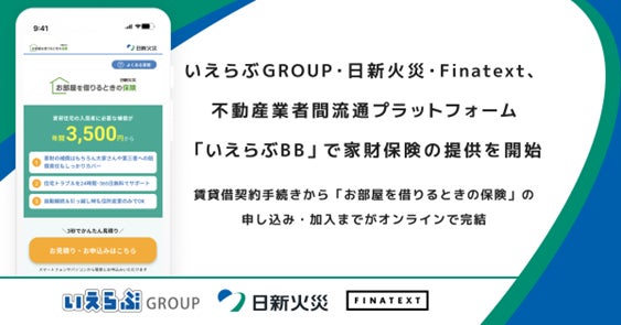 株式会社いえらぶGROUP(本社:東京都新宿区、代表取締役:岩名 泰介、以下「いえらぶGROUP」)、日新火災海上保険株式会社(本社:東京都千代田区、取締役社長:織山 晋、以下「日新火災」)、株式会社Finatext(本社:東京都千代田区、代表取締役CEO:木下 あかね、以下「Finatext」)は、不動産業者間流通プラットフォーム上で家財保険に申込み・加入できる仕組みを共同開発しました。不動産のリーシング業務をワンストップでオンライン化する業者間流通プラットフォーム「いえらぶBB」内で、インターネット完結型の賃貸入居者向け家財保険「お部屋を借りるときの保険」の提供を開始します。