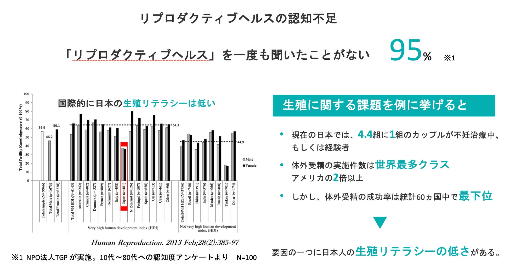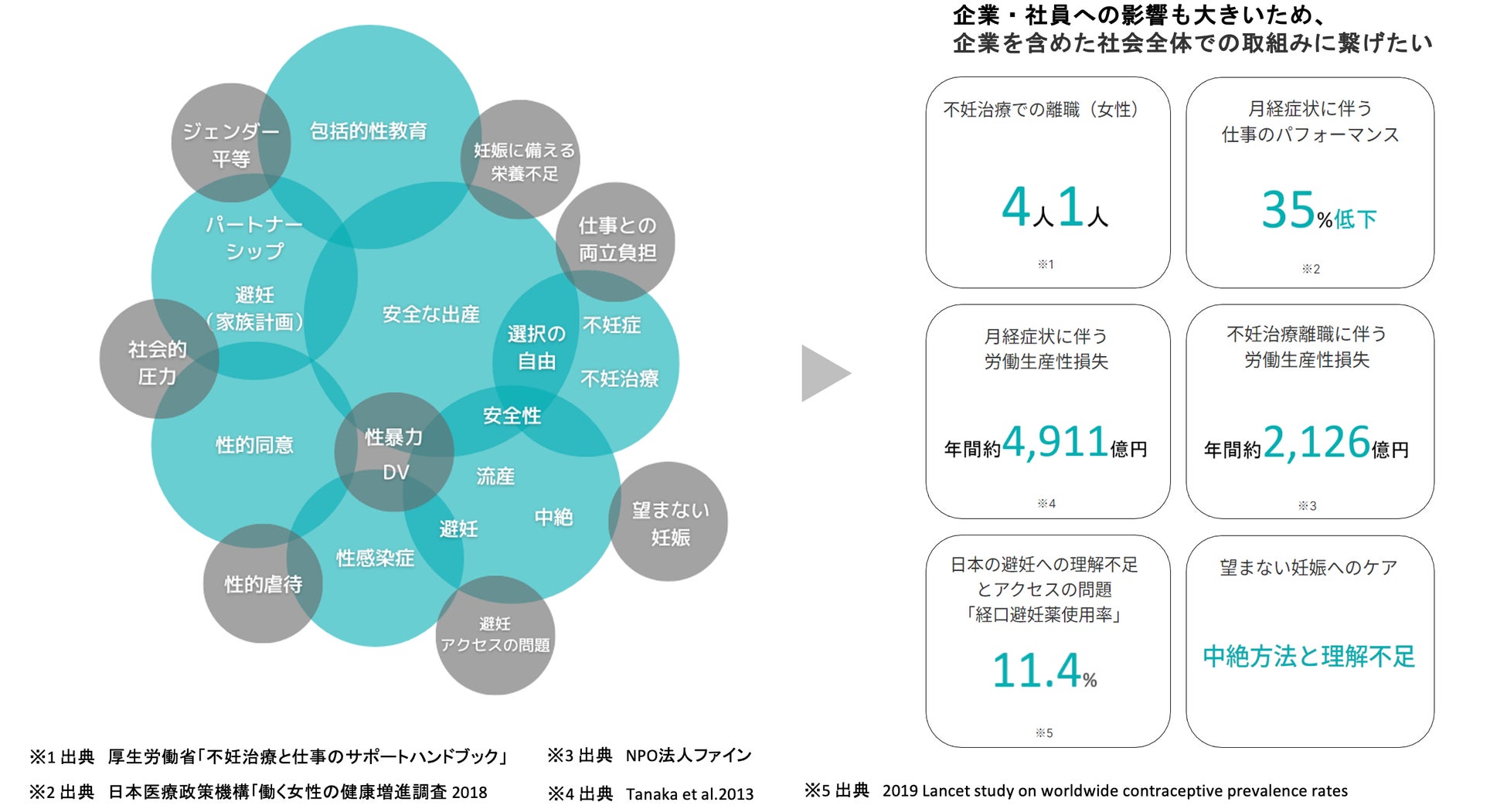リプロダクティブヘルスとは、「性や生殖に関わるすべてにおいて、⾝体的にも精神的にも社会的にも本⼈の意思が尊重され、⾃分らしく⽣きられること」を指します。この概念は、1994年にエジプト・カイロで開催された国際⼈⼝開発会議において提唱されました。日本でも、国の施策として、内閣府の男女共同参画局では「生涯を通じた女性の健康支援*」にリプロダクティブヘルスに関する意識の浸透や対策の推進などを掲げていますが、この⽤語が提唱されて30年近くを経た現在も、認知度や関⼼が低いために、ほとんど議論や改善がされていません。日本は、世界的に見ても周回遅れにて、多くの課題が残っています。すべての⼈の権利が守られ、安⼼・安全・健康な⽣活を送るために企業を含めた社会全体での取り組みが必要とされています。