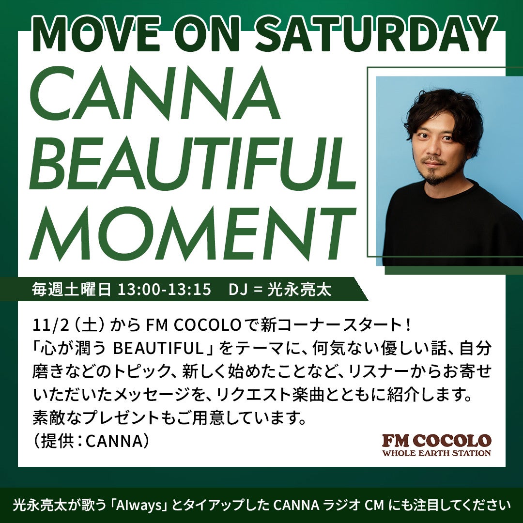 株式会社アッツ(所在地:大阪府西区、代表取締役:山崎 晶久)は、11月2日(土)よりFM COCLOにてCANNAのTVCMの楽曲提供いただいている光永亮太さんのラジオ番組『MOVE ON SATURDAY』にて『CANNA BEAUTIFUL MOMENT』が開始します。