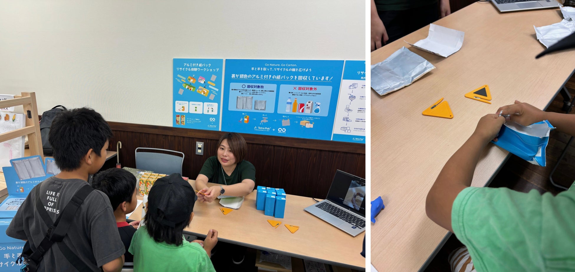 ワークショップには80名以上が参加し、アルミ付き紙容器がリサイクルができることや資源循環について学びました。