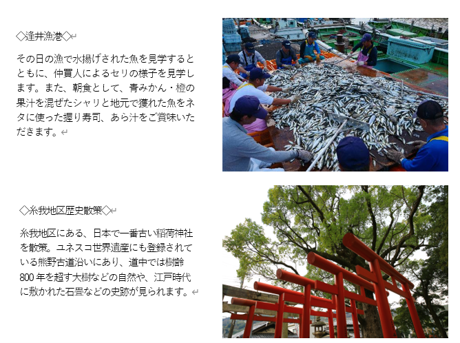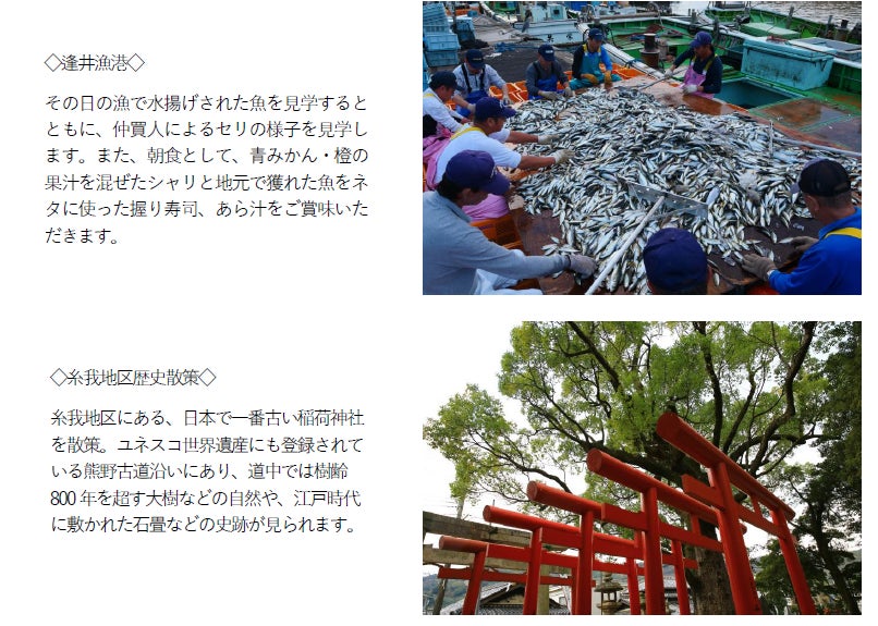 令和5(2023)年度第3回は、和歌山県有田地域(有田市、有田川町、広川町、湯浅町)に、タイのABCクッキングスタジオ会員を招き、10月30日(月)から3泊4日でツアーを開催いたします。有田地域特産のみかんを堪能する体験(みかん狩り・選果作業見学)や、新鮮な海の幸を味わう体験(魚捌き・寿司握り・セリ見学)を予定しているほか、ワイナリーや酒造の見学等、有田地域の魅力がたっぷり詰まったツアーを予定しています。