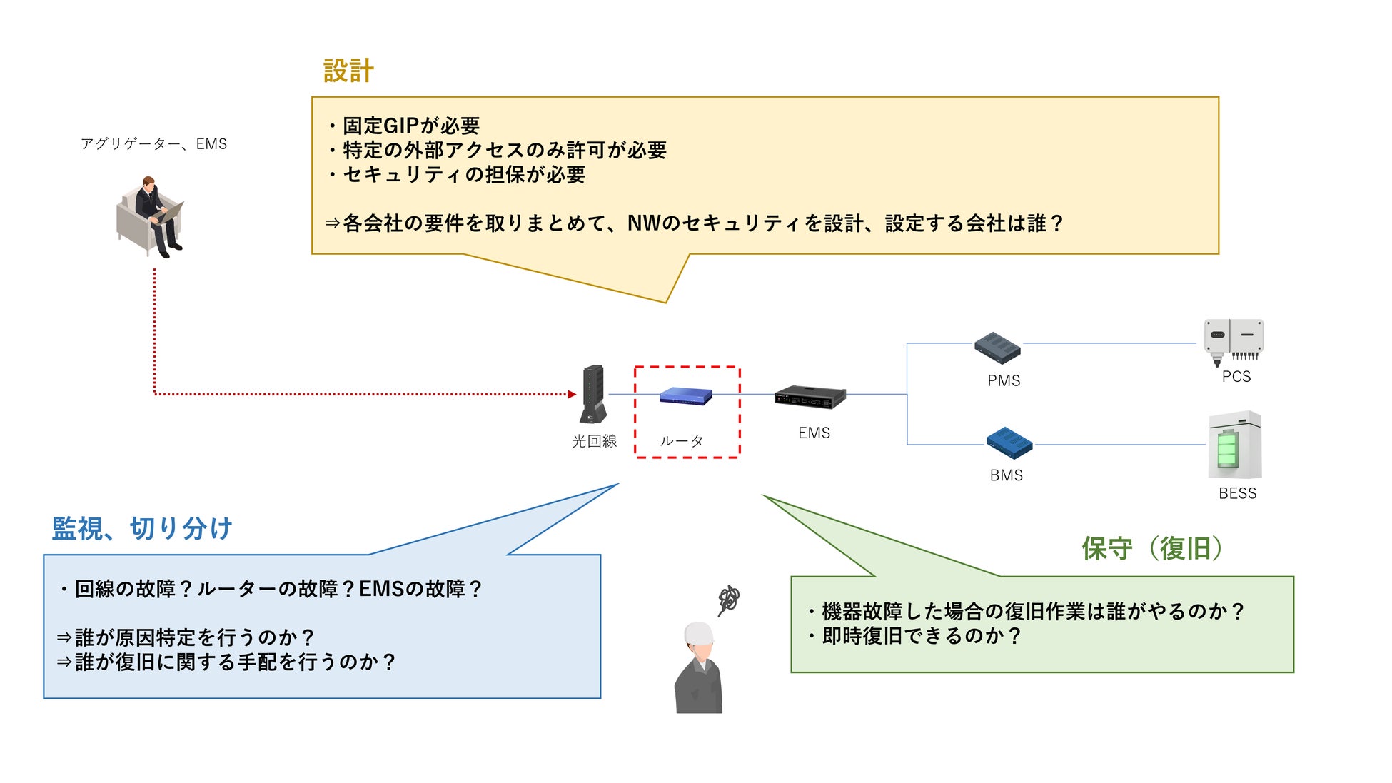 また太陽光設備と異なり、蓄電所ではEMSやアグリゲーターからの外部アクセスが求められるのでセキュリティを担保しながら特定の外部アクセスを許可するNW設計を行う必要があります。