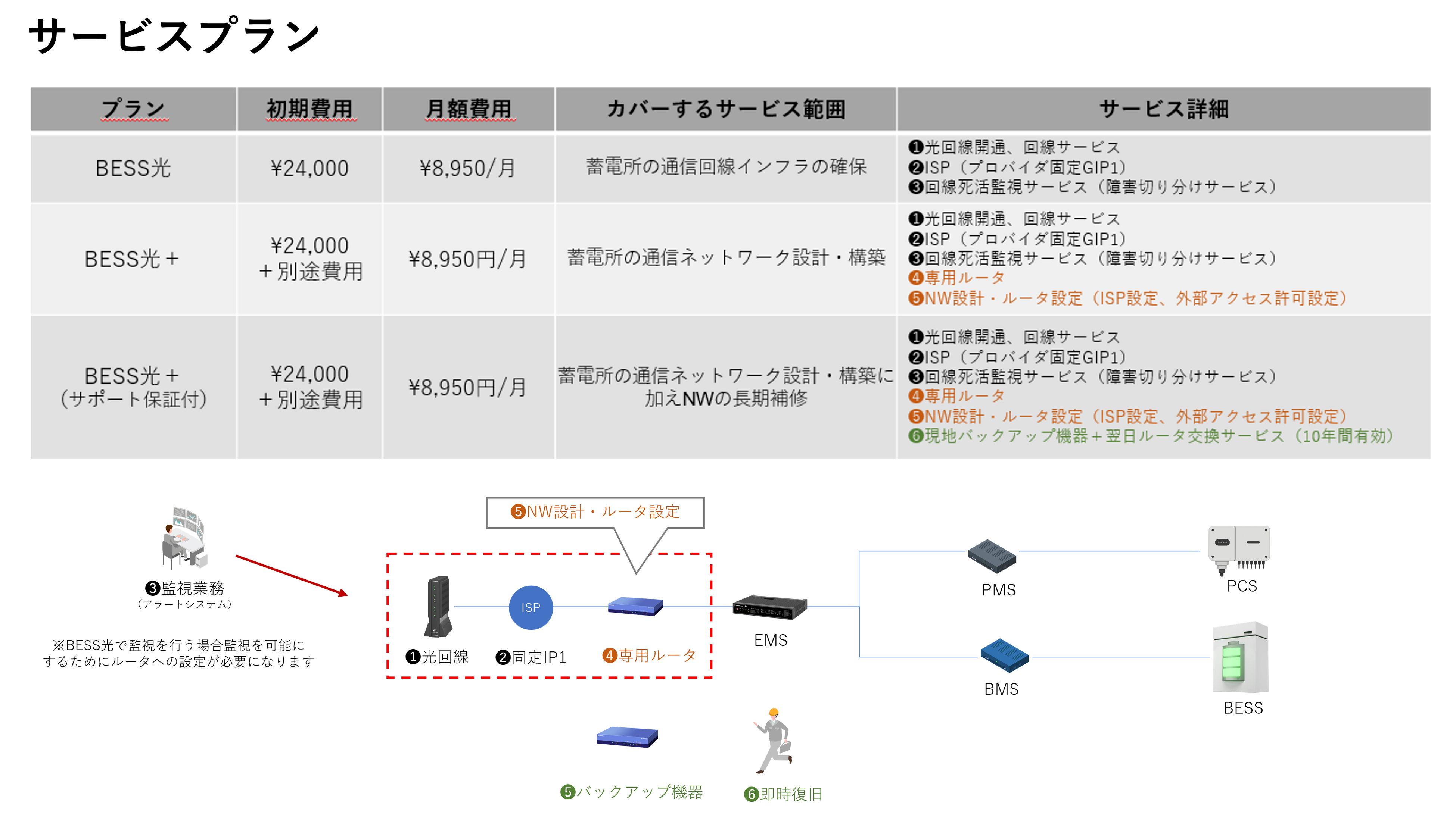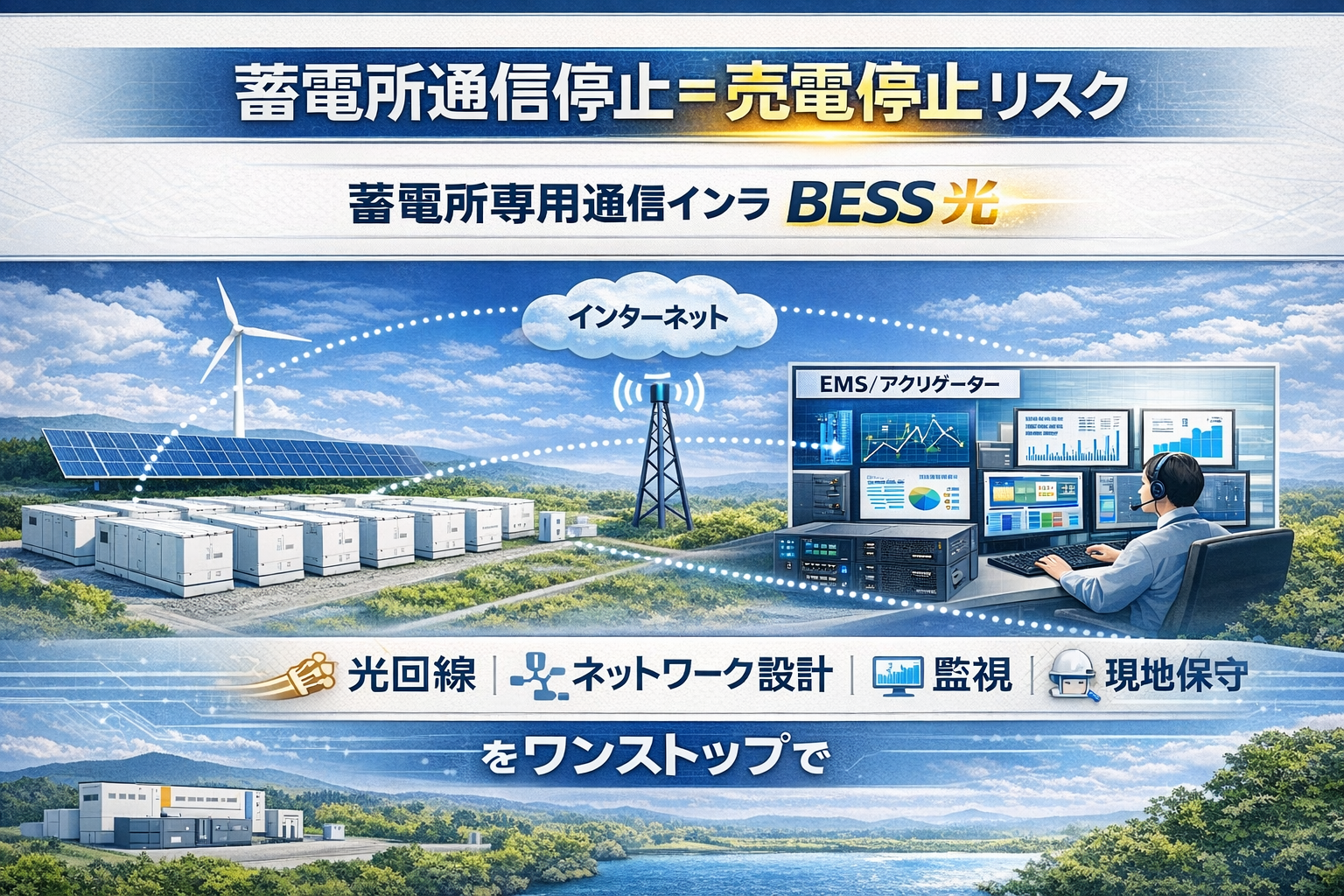 BESS光は、通信回線・ネットワーク設計・通信監視・保守を一体化したサービスであり、蓄電所の通信インフラをワンストップでサービス提供する。