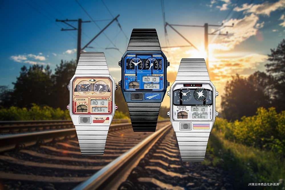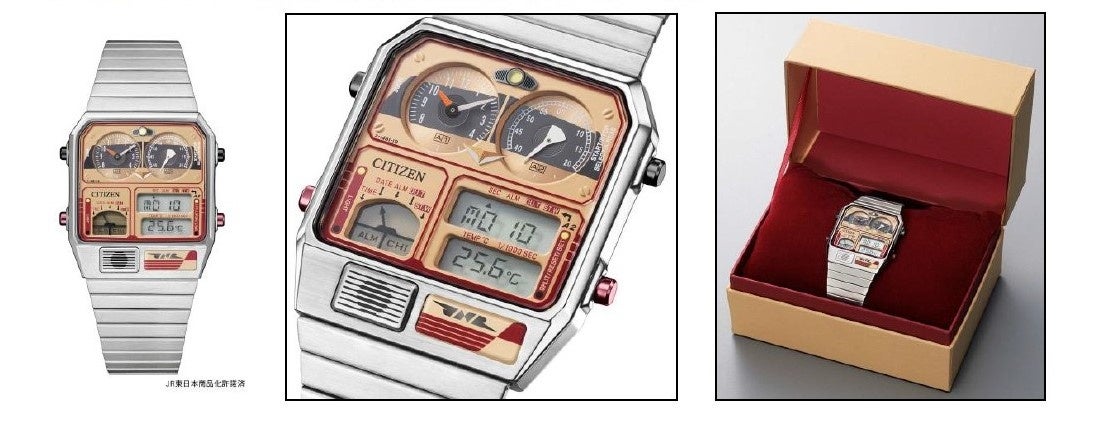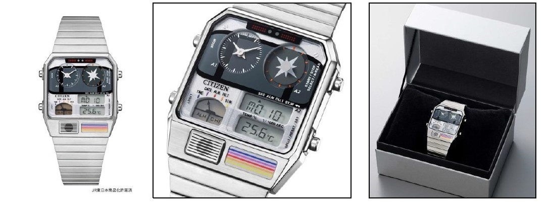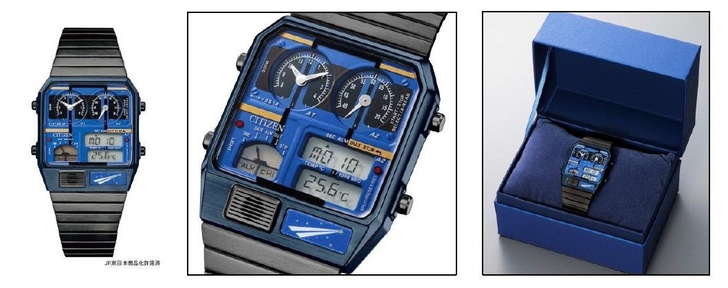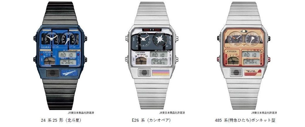 国鉄時代から約四半世紀にわたって多くの方に親しまれてきた485 系(特急ひたち)ボンネット型、ブルートレインの愛称で知られ、惜しまれながらも2015年に引退した寝台特急列車24系25形(北斗星)、斬新なデザインと豪華な内装から憧れの寝台特急として名高い寝台特急列車E26系(カシオペア)、の3車両の特徴的なカラーやモチーフを、アナログとデジタルを組み合わせたメカニックなデザインの「アナデジテンプ」に落とし込み、鉄道好きも時計好きも楽しめる商品となっております。