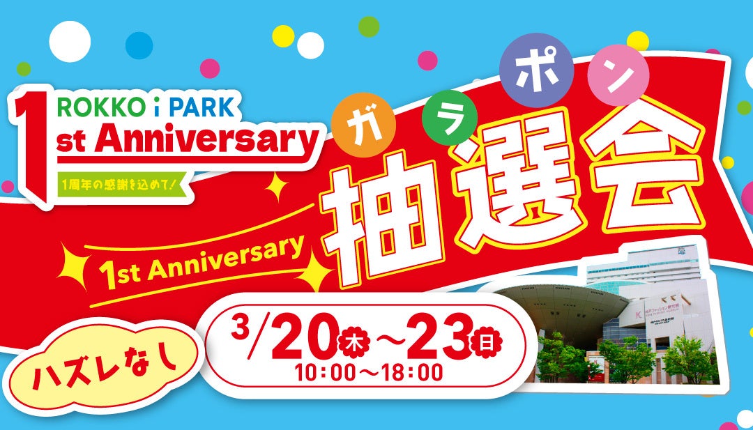 3月1日でオープン1周年を迎えたROKKO i PARKでは、3月20日(木・祝)〜 23日(日)の4日間【1st ANNIVERSARY抽選会】を開催いたします。