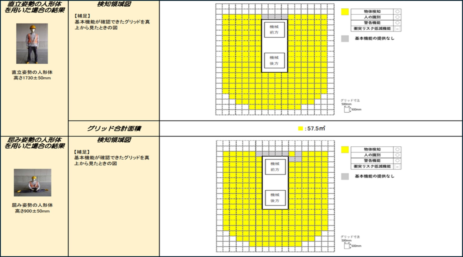 NETISホームページで公表されている「テーマ設定型の比較表」No.46 建設機械の安全装置に関する技術(ブルドーザ・ホイールローダ)では、試験用の建設機械にドボレコを取り付けた様子の画像や、建設機械周囲にマネキンを設置して実験を行った際の検知領域の結果などが紹介されています。