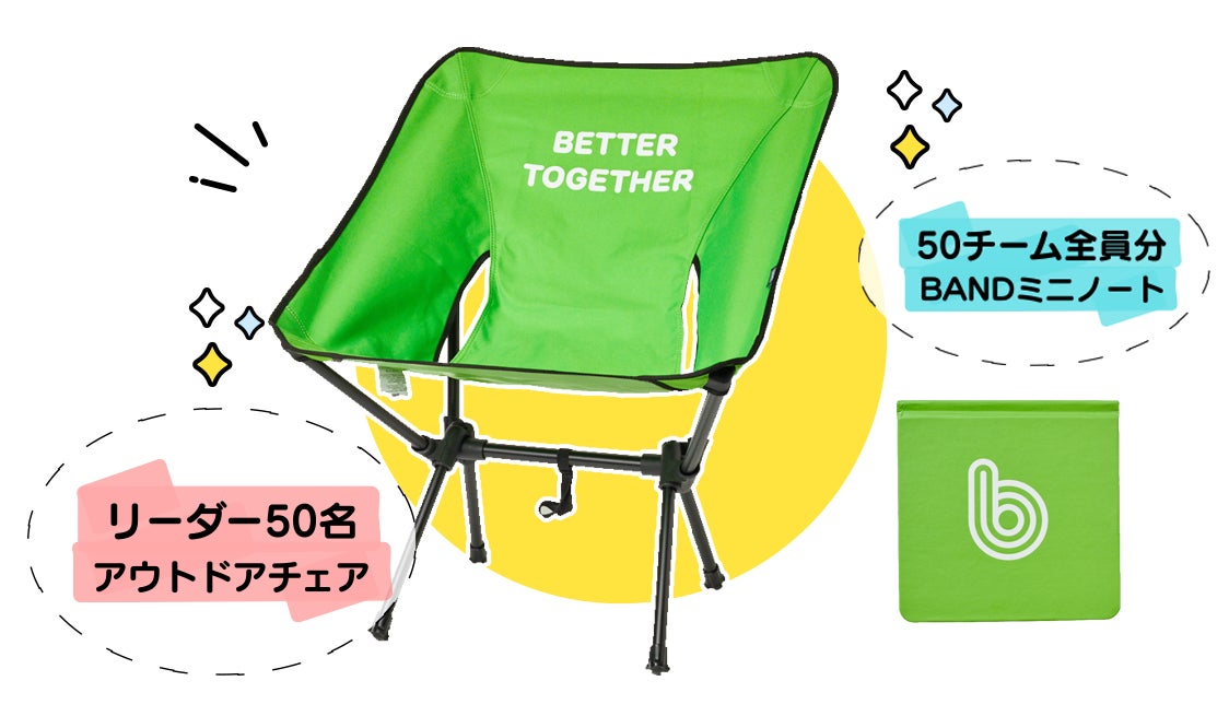 忙しい時、もっと効率的で楽しい二刀流グループ活動をBANDを体験してみましょう!今新しいBandグループを作り、メンバーを3人以上招待すると50チームのリーダーにはBANDアウトドアチェアをチーム全員にミニノートをプレゼントします。