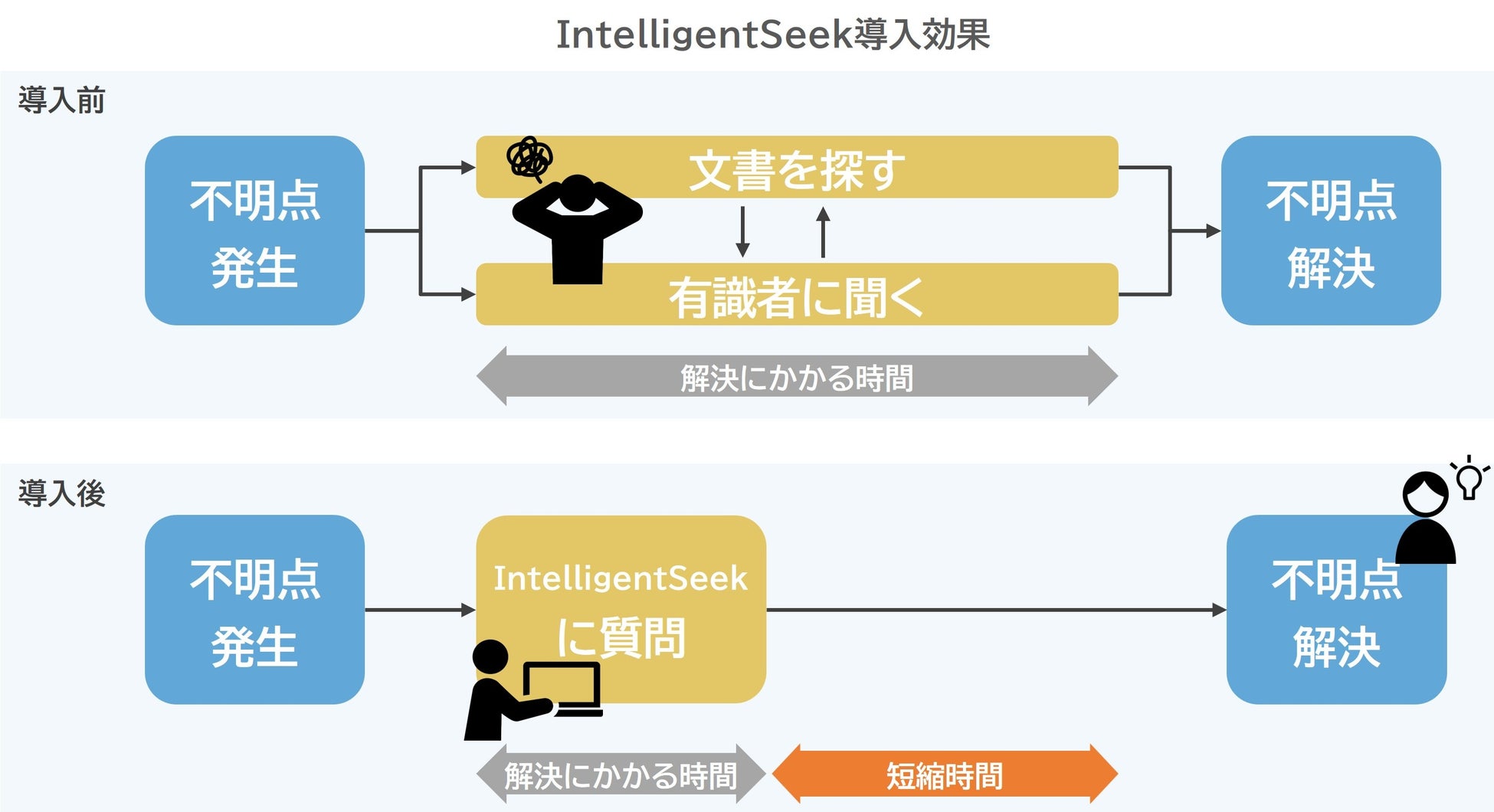 これまでは、情報検索・有識者へのヒアリング等に手間と時間を要していましたが、「IntelligentSeek」の活用により、ユーザーは自然言語で簡単に質問を入力(~について教えて)するだけで、必要な情報・ドキュメント内の記載箇所を数秒で表示することが可能となりました。この革新的な機能により社員の検索プロセスが大幅に改善され、より効率的に業務を進めることが可能となります。