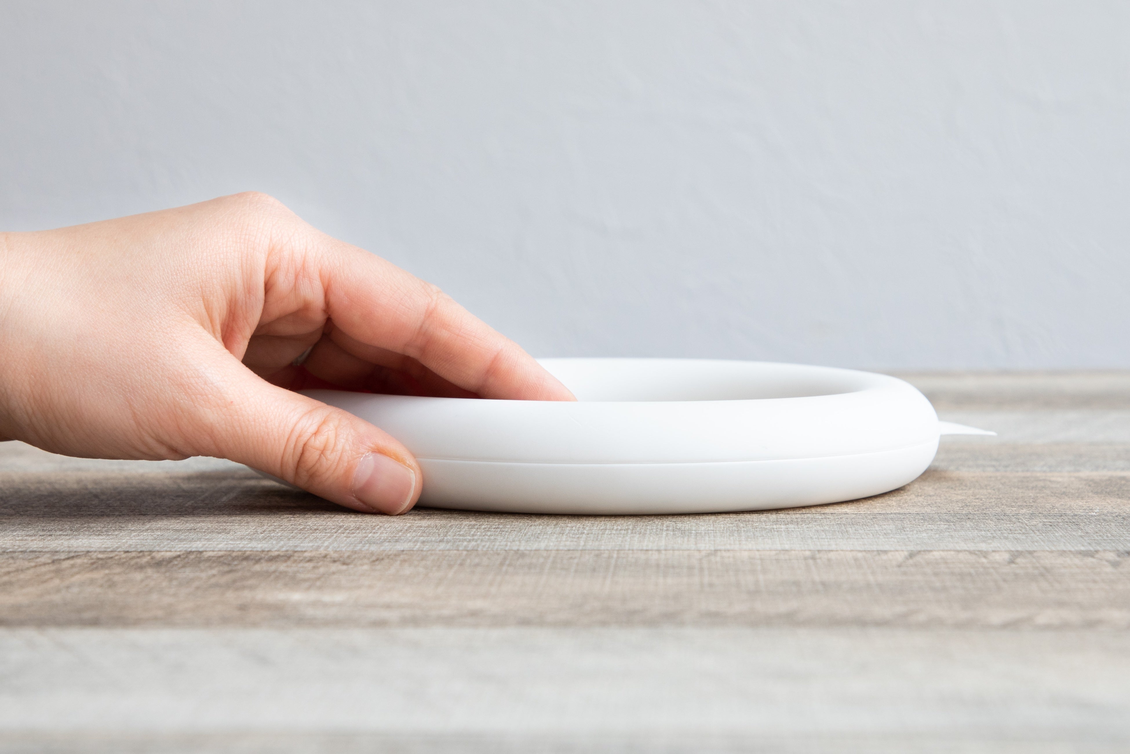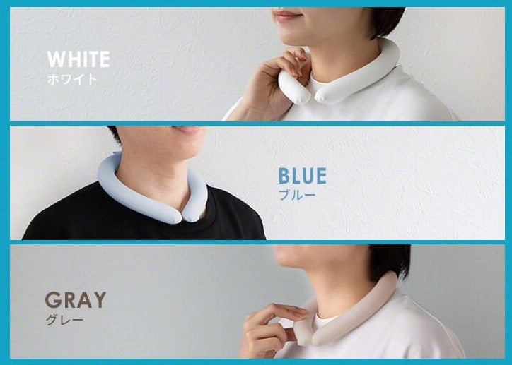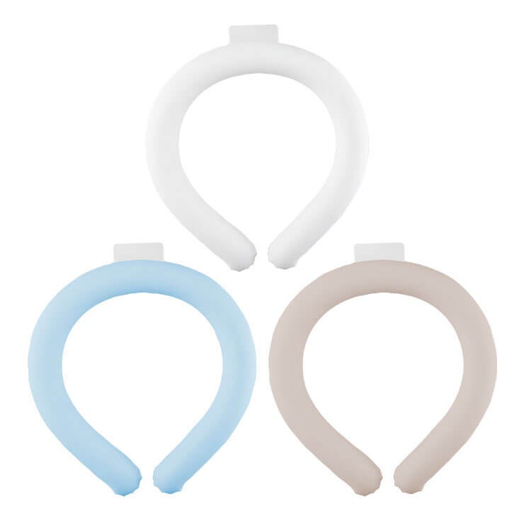 「HIERUWA」は従来製品よりもリングを太くし、保冷持続時間を約120分に延ばすことに成功しました。太いリングで接触面積が増えたことにより、ひんやり感がさらにアップ。ホワイト、ブルー、グレーの3色あり、落ち着いたくすみカラーなのでお出かけにも使いやすいカラーです。
