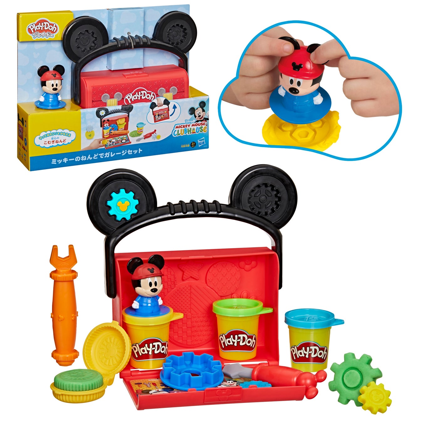 ミッキーフィギュアの底面で、ミッキーの形をスタンプしよう!おもちゃのガレージで4つのツールを使ってミッキーと修理やさんごっこをしよう!おもちゃのドライバーでねんどをスライス&カットしたり、型でタイヤを作ったり、いろんな遊びを楽しもう。