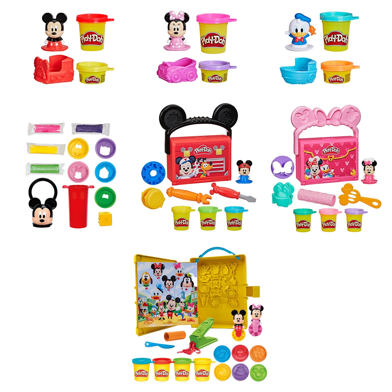 ラインアップは全7種類。気軽に遊べるキャラクタースタンプセットをはじめ、キャラクターのさまざまな表情がつくれるセット、ミッキーとガレージで修理ごっこができるプレイセット、ミニーとベーカリーでパン屋さんごっこができるプレイセット、さらに絵合わせや感覚遊び、おはなし遊びが楽しめるえほんセットなど多彩なシリーズを展開します。