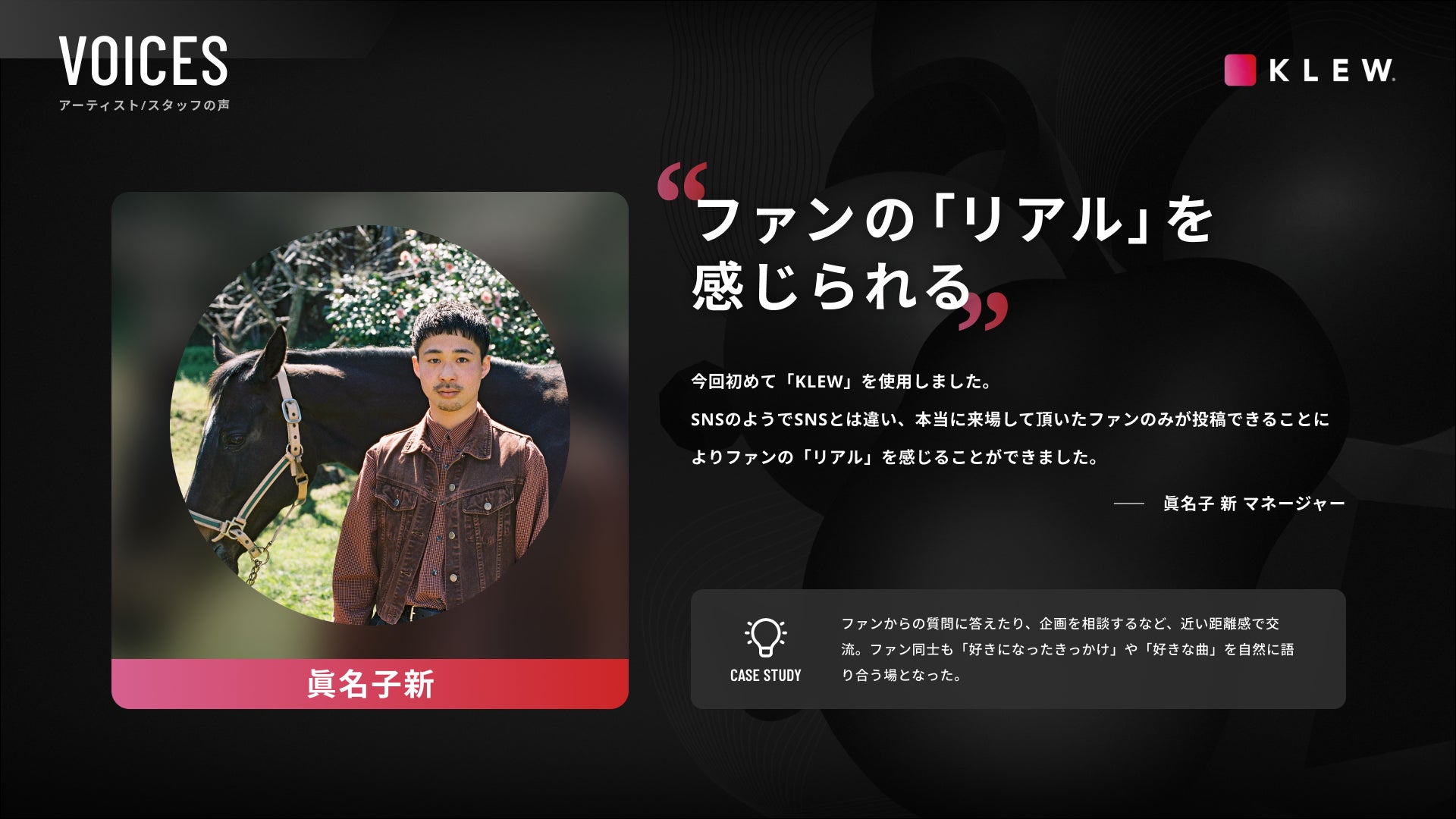 KLEWは、同一公演のライブチケットを保有するファン同士やファンと出演するアーティストだけがデジタル上でコミュニケーションを取れる国内初のプラットフォームとして2024年11月にリリース。