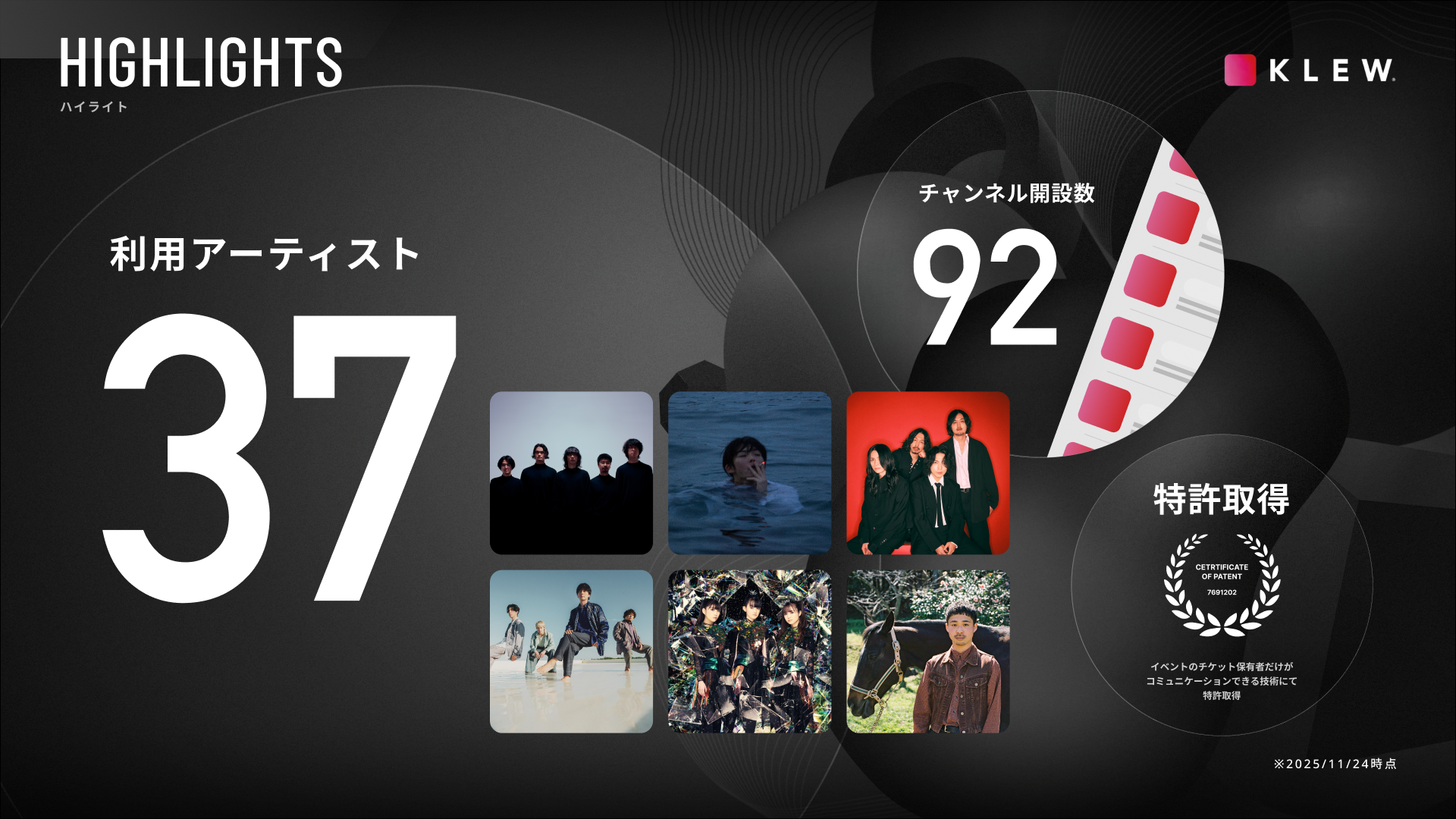 「あらゆるチケットを入場券からコミュニケーションツールへ進化させる」をコンセプトに、アーティストとファン、そしてファン同士がライブの熱量を共有し、関係を深めながらライブ体験を豊かにする新しいコミュニケーションの場を提供してきたKLEWは、サービス開始から1年で、37組のアーティストにご利用いただき、開設チャンネル数は92にまで拡大しました。