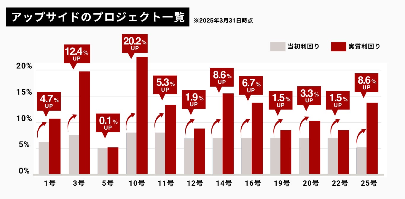 これまでに募集したリノベーションプロジェクトは、25件中の8件あり、運用終了したプロジェクトのうち70%以上がアップサイドでの配当となりました(2025年3月31日時点)。