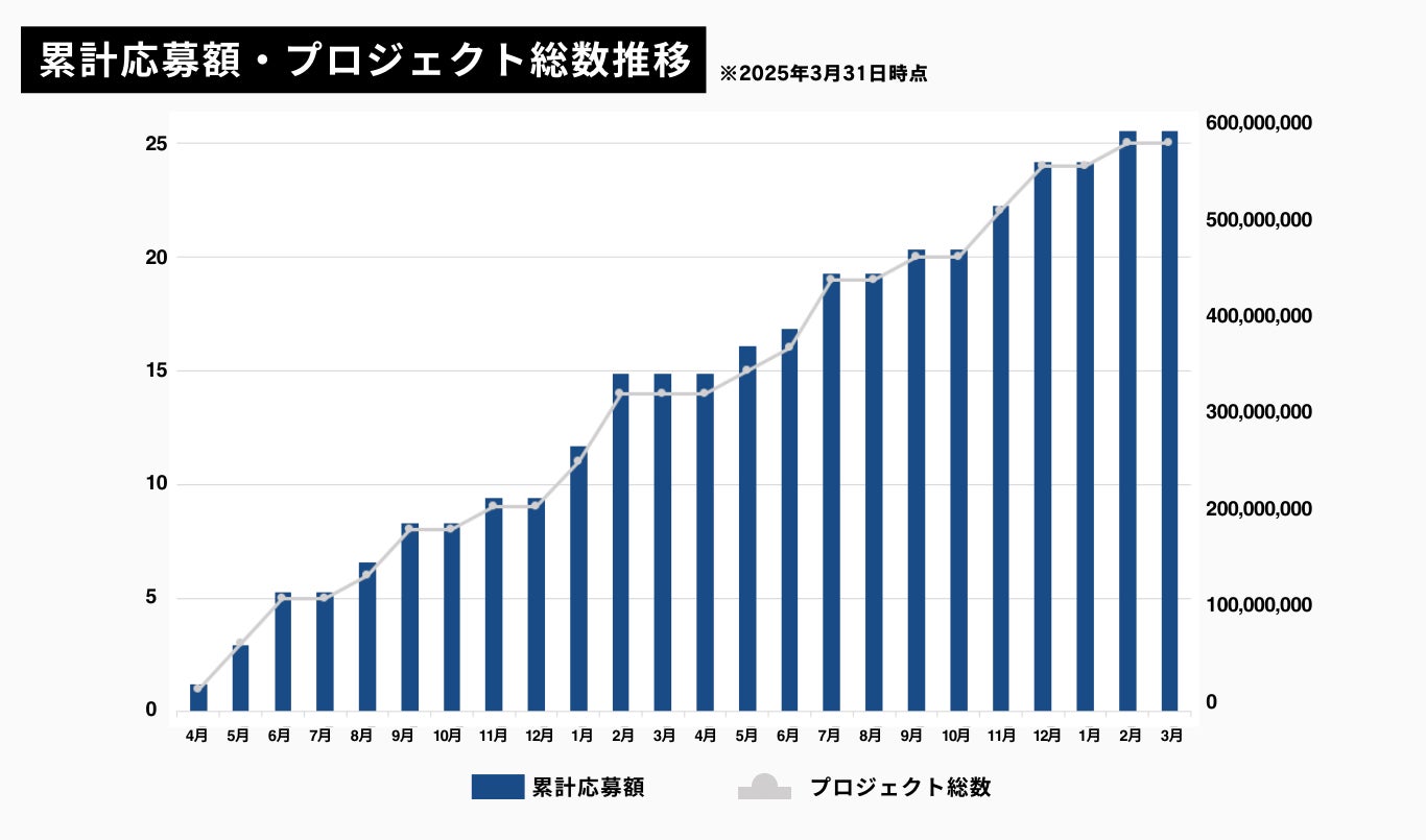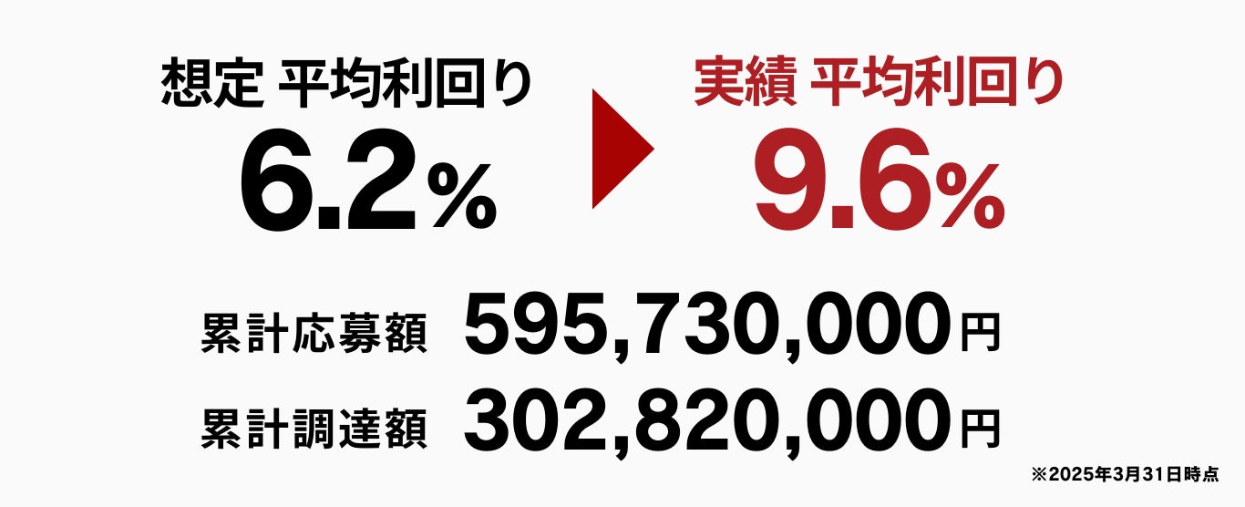 不動産クラウドファンディング「投活」では、2023年3月17日のサービス開始から、2年間で募集したファンド数は25件、応募総額は5.9億円になりました。小規模不動産特定共同事業という出資合計額1億円の枠の中で、最高9,969万円までファンドを積み上げました。運用終了したファンドの確定利回りは、想定よりも3.4%上昇して、平均9.6%でした。