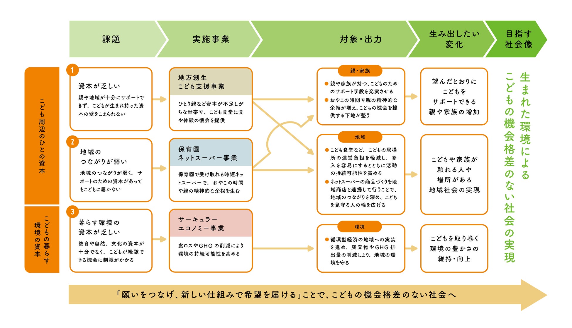 わたしたちネッスーが何を課題としてとらえ、どんな事業を行い、どのように「こどもの機会格差のない社会」を実現しようとしているのか、社会に変化を起こす過程をひとつの 図にまとめました。