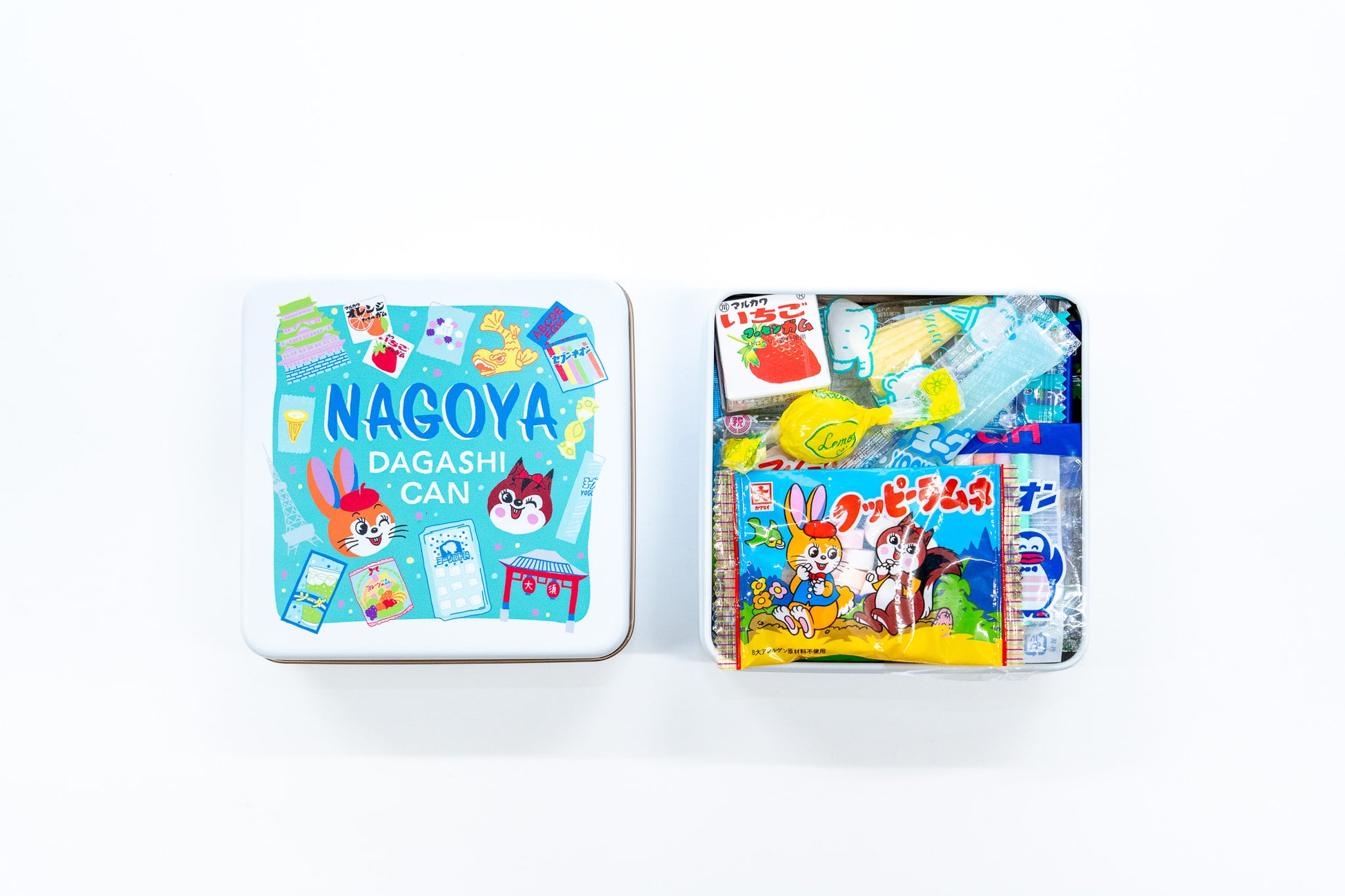 名古屋の駄菓子文化を詰め合わせた、わくわくする宝石箱のようなBOX缶。ひとたび缶を開けると、そこにはこのエリアでつくられた駄菓子がたくさん詰まっています!実は駄菓子をつくる会社がこのエリアに非常に多いことをより多くの方に知っていただきたいとの思いから誕生した商品。小さいお子様から大人まで幅広い世代の人を笑顔に、また、商品を通じて「懐かしい!」とコミュニケーションが生まれることで、この地域の良さを再発見していただれば幸いです。今回使用した缶についても、愛知県海部郡大治町にある「側島製缶」に製造していただき缶のデザインを施したデザイナーも岐阜県出身。全て愛知県&岐阜県でできた商品になります。