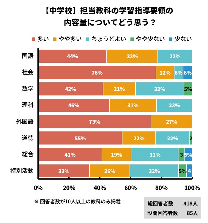「多い」「やや多い」回答割合は小学校に比べてさらに高い傾向にあり、回答者数が10人以上の教科の中で比較すると、外国語(100%)、社会(88%)、国語(78%)、理科(77%)、道徳(76%)、数学(63%)、総合・特別活動(各60%)の順で高くなっています。特に外国語は、回答者15人のうち11人が「多い」、4人が「やや多い」と答え、小学校の外国語と同様、非常に多くの割合の方が「多い」「やや多い」と回答しました。
