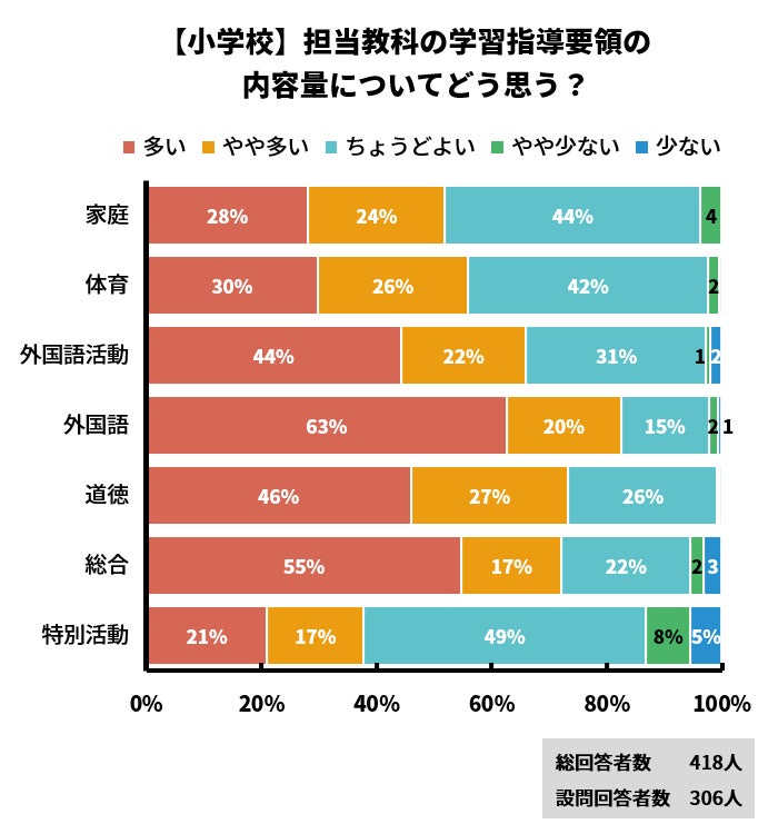 「多い」「やや多い」回答割合は外国語(83%)、国語(81%)、算数(78%)、道徳・社会(各73%)、総合(72%)の順で高くなっています。