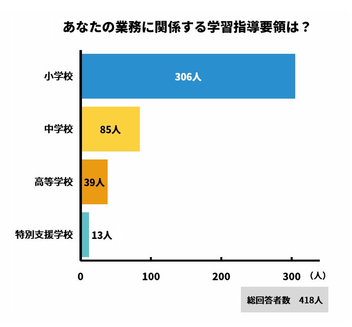 アンケート回答者は小学校に関わる教職員が最も多く306人、次いで中学校が85人、高等学校が39人、特別支援学校が13人となっています。
