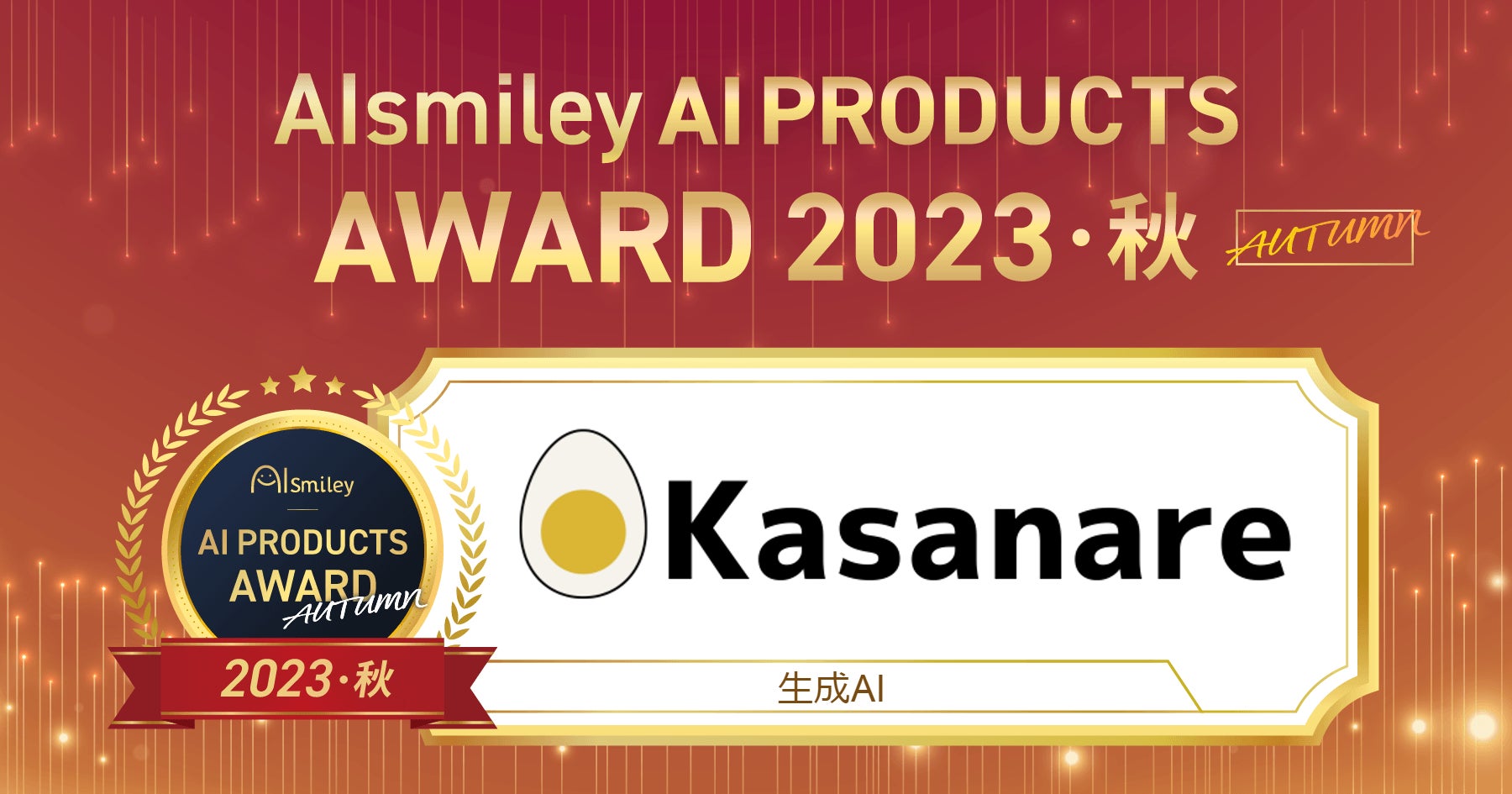 今回の「AIsmiley PRODUCT AWARD 2023 AUTUMN」は2023年6月1日から2023年8月31日までの3ヶ月間を審査対象としており、「Kasanare」は「生成AI」製品部門で選出されました。